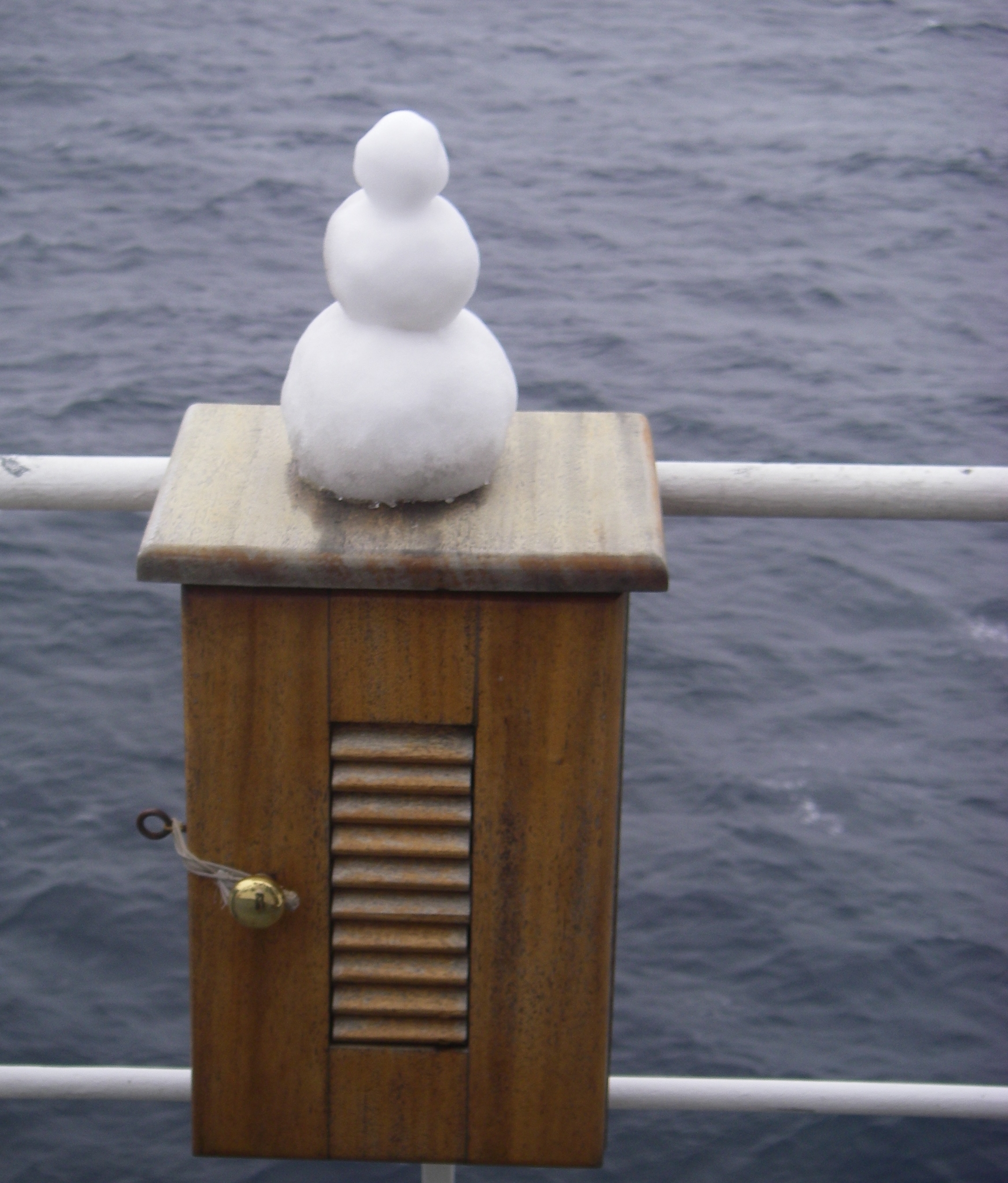 A snowman on the bridge of the USCGC Healy icebreaker on the Bering Sea.