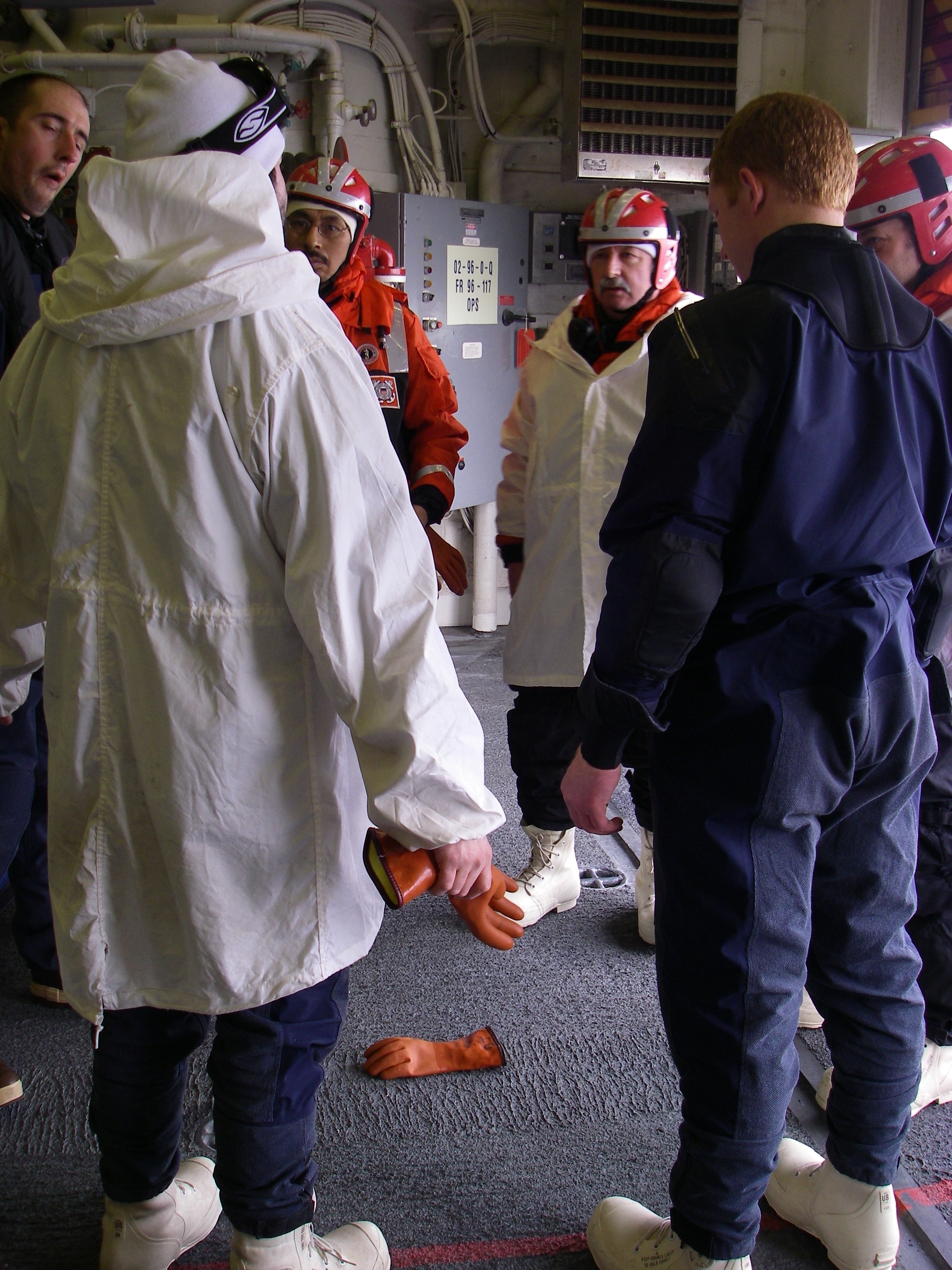 The plan of attack to tag the seal. The "seal" is the glove lying on the floor. On the USCGC Healy icebreaker, on the Bering Sea.