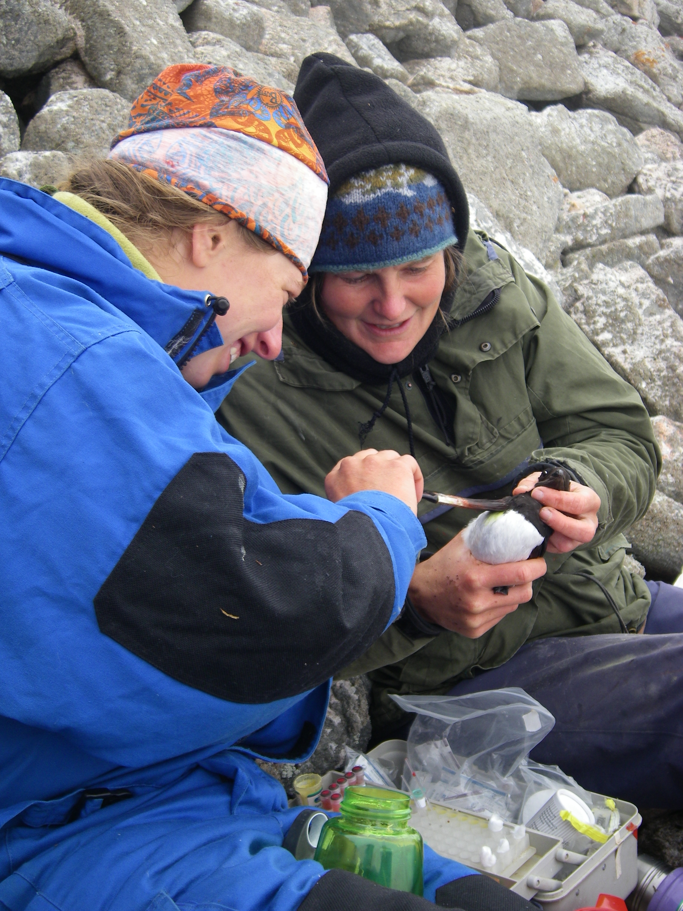 Rachael Orben applies picric acid while Ann Harding holds a Little Auk. Kap Hoegh, Greenland.