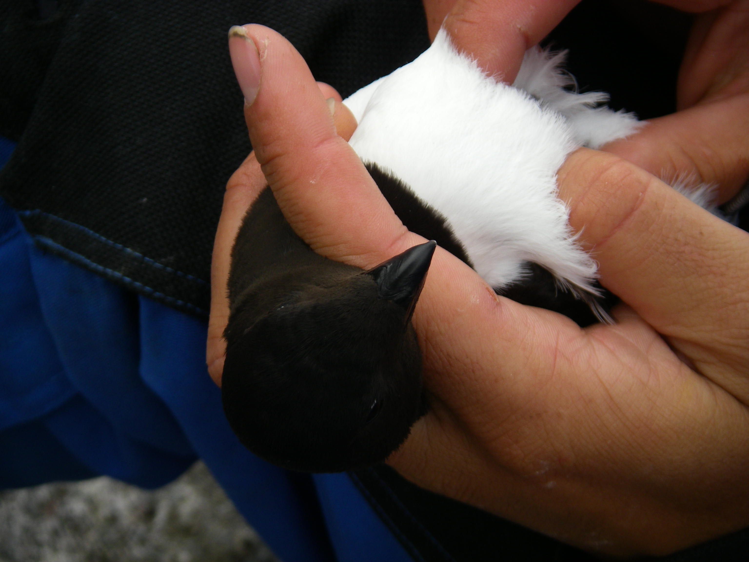 Adult Little Auk being examined for the presence of a brood pouch. Kap Hoegh, Greenland.