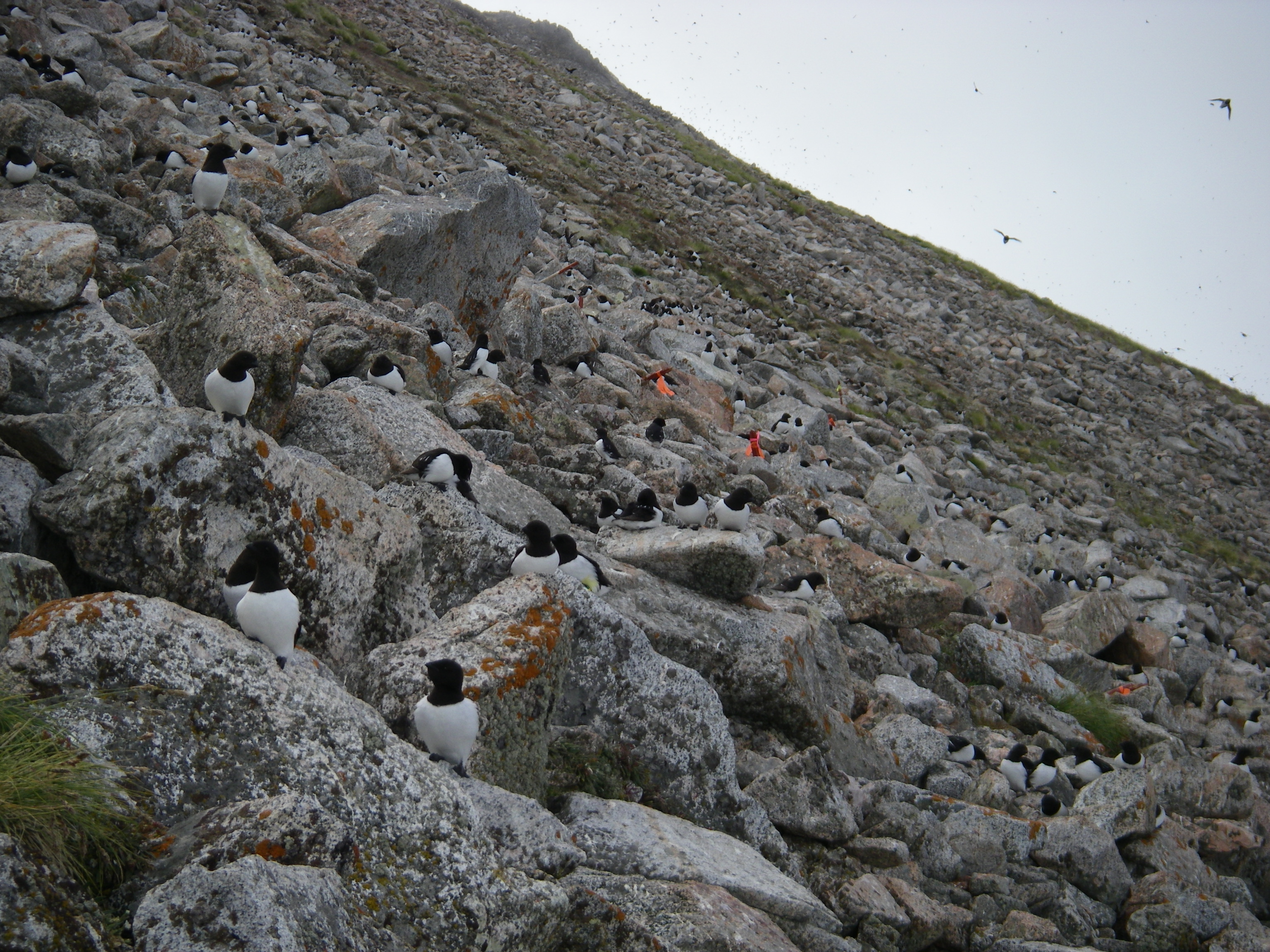 Little Auks sitting atop boulders outside of their nests. Kap Hoegh, Greenland.