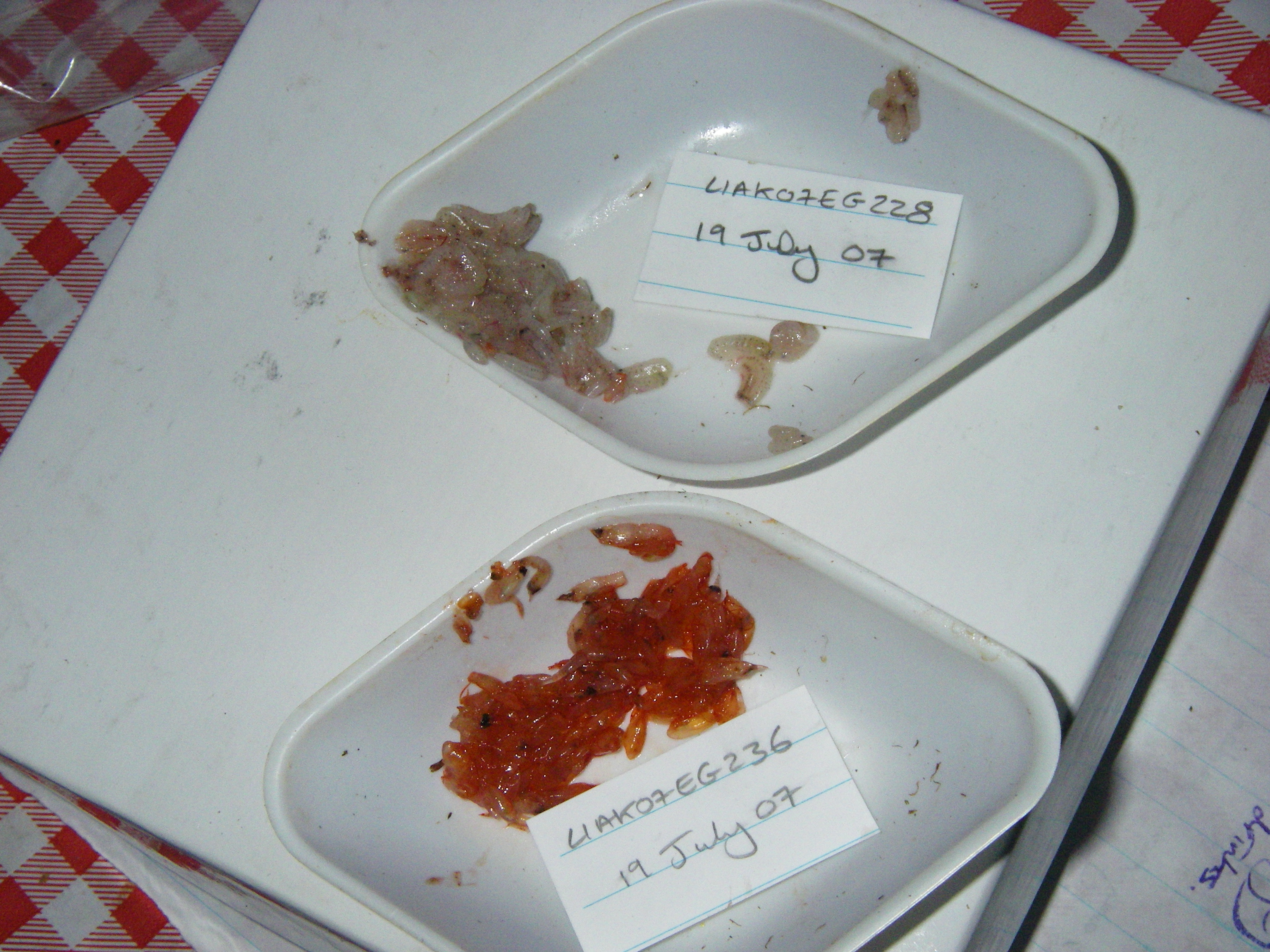 Samples of gular pouch contents from two different Little Auks. Copepods and amphipods are represented. At a hunting cabin in Kap Hoegh, Greenland.