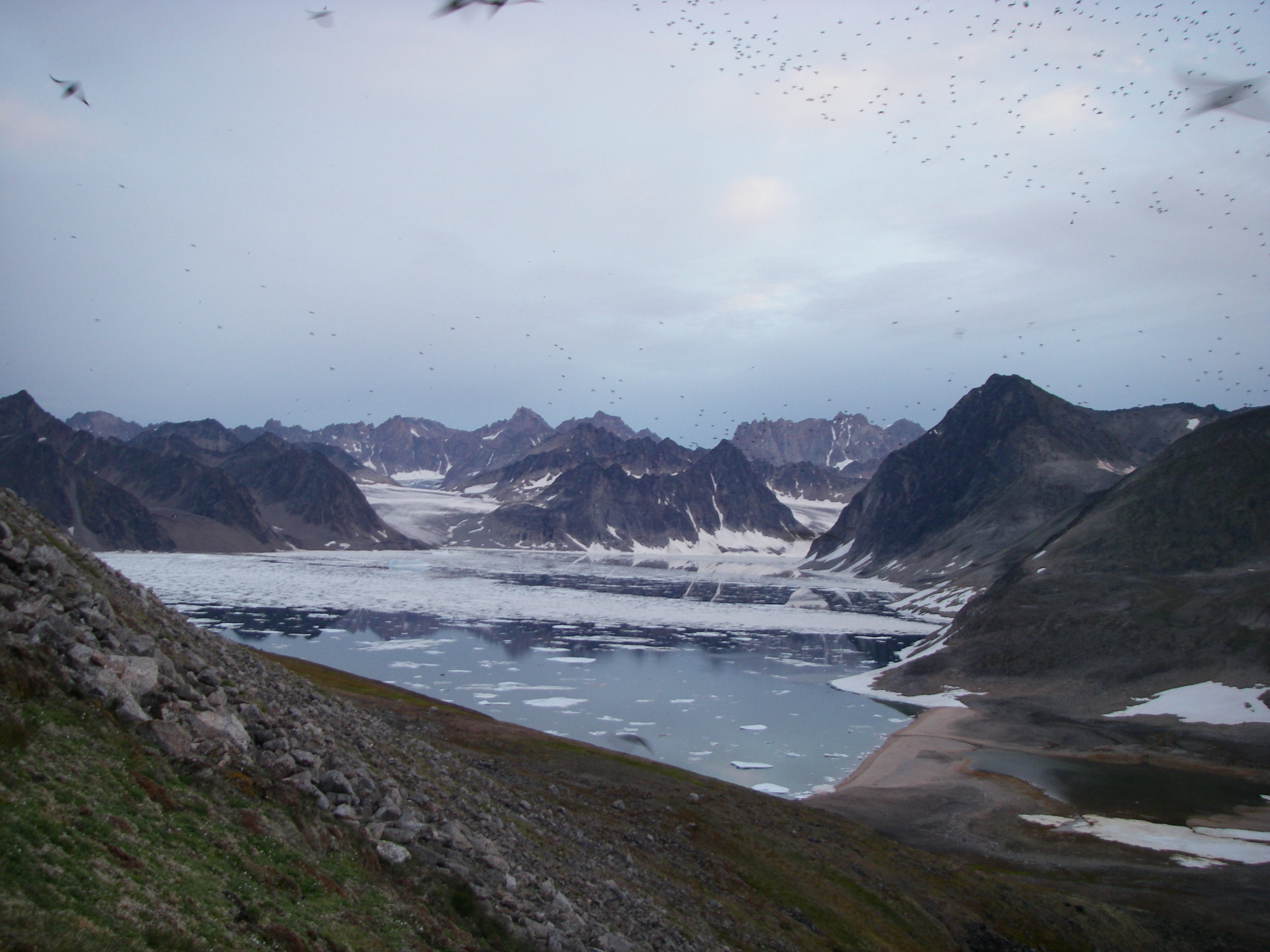 Little auks circle over Kording Fjord in the Greenland Sea. Kap Hoegh, Greenland.