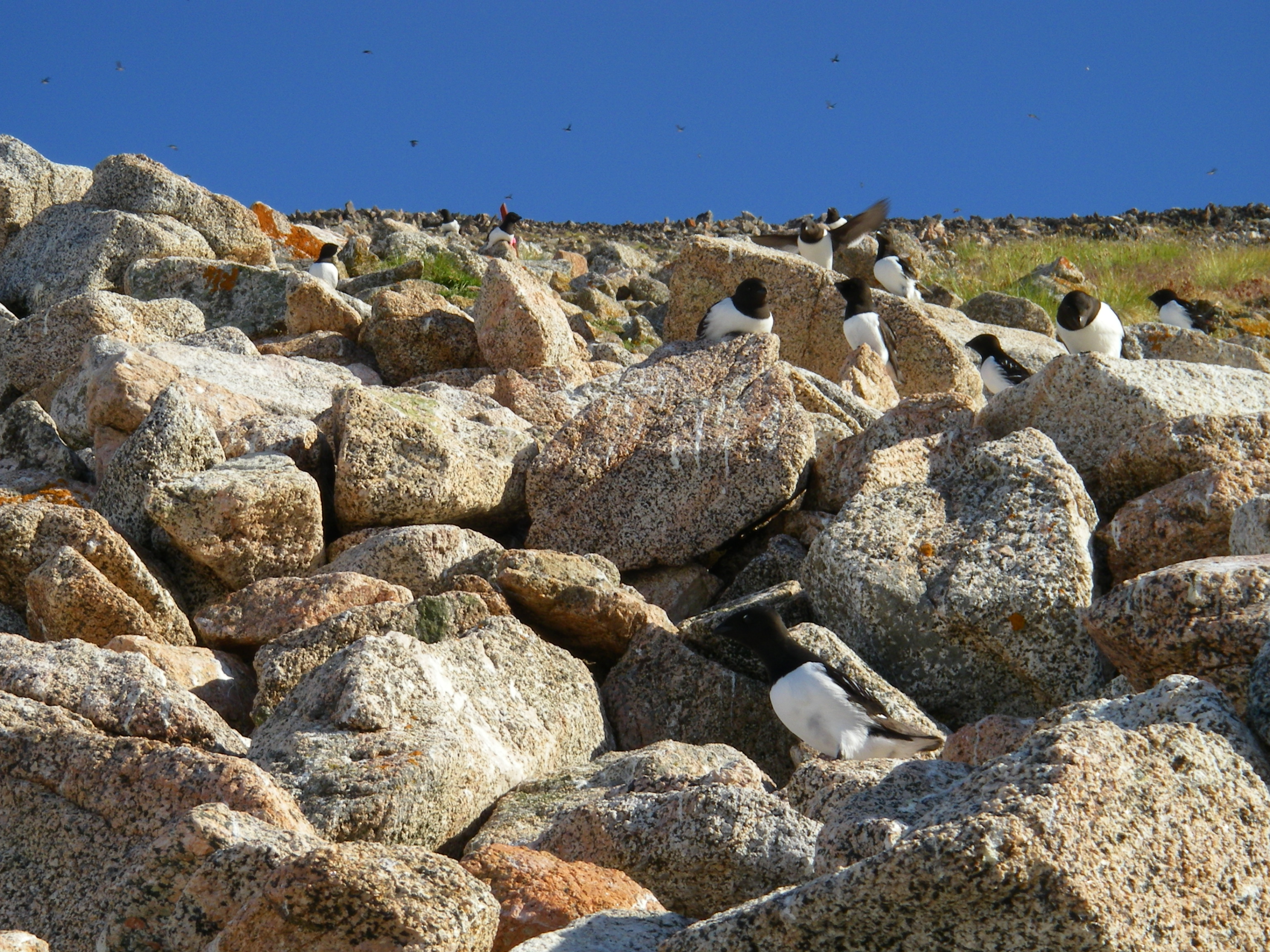 Adult Little Auks enjoying the sunshine and showing off their nests. Kap Hoegh, Greenland.
