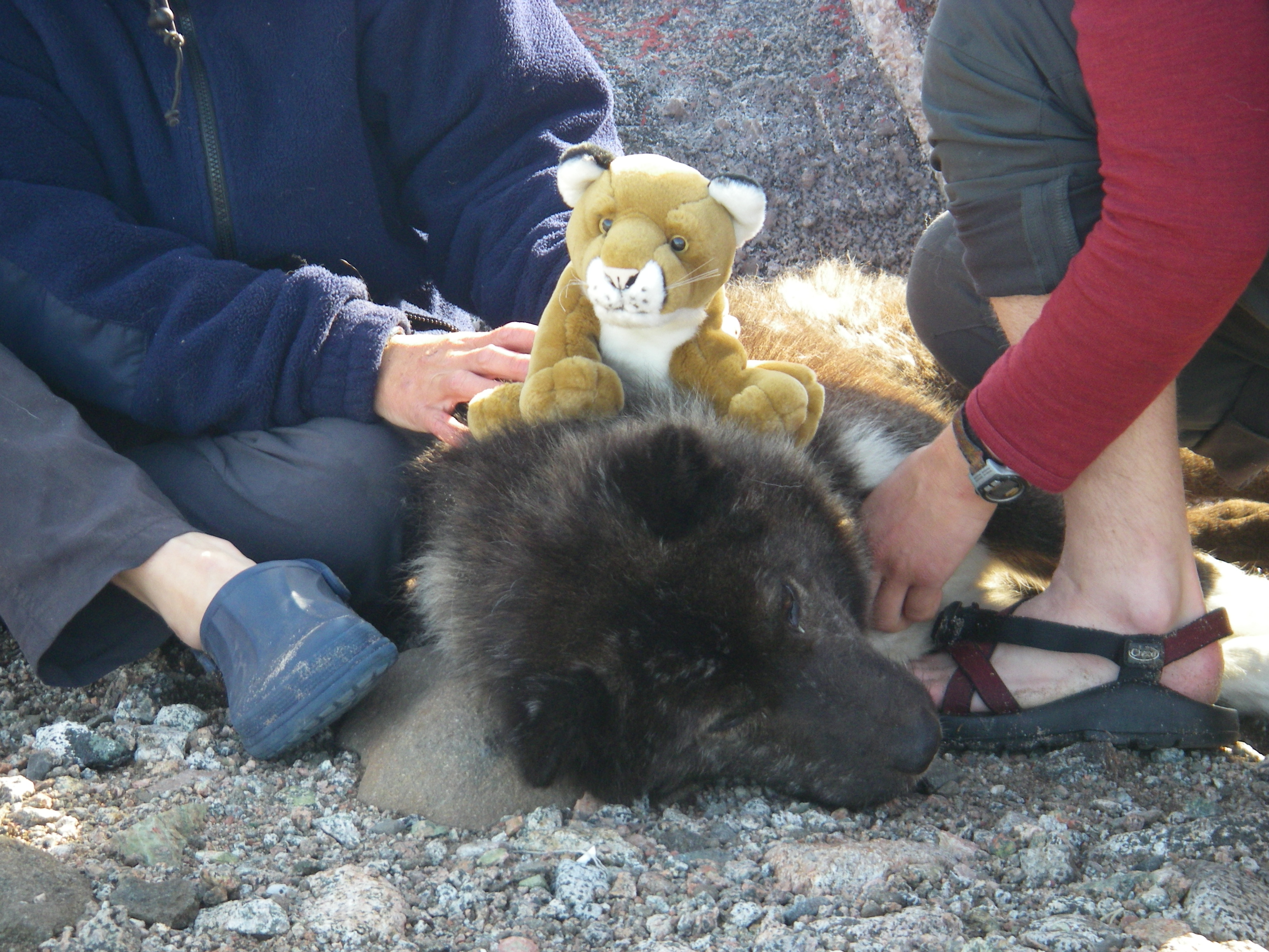 CJ, the traveling cougar from Chico Junior High School sits proudly atop Abe, the guard dog, on a sunny day. Kap Hoegh, Greenland.