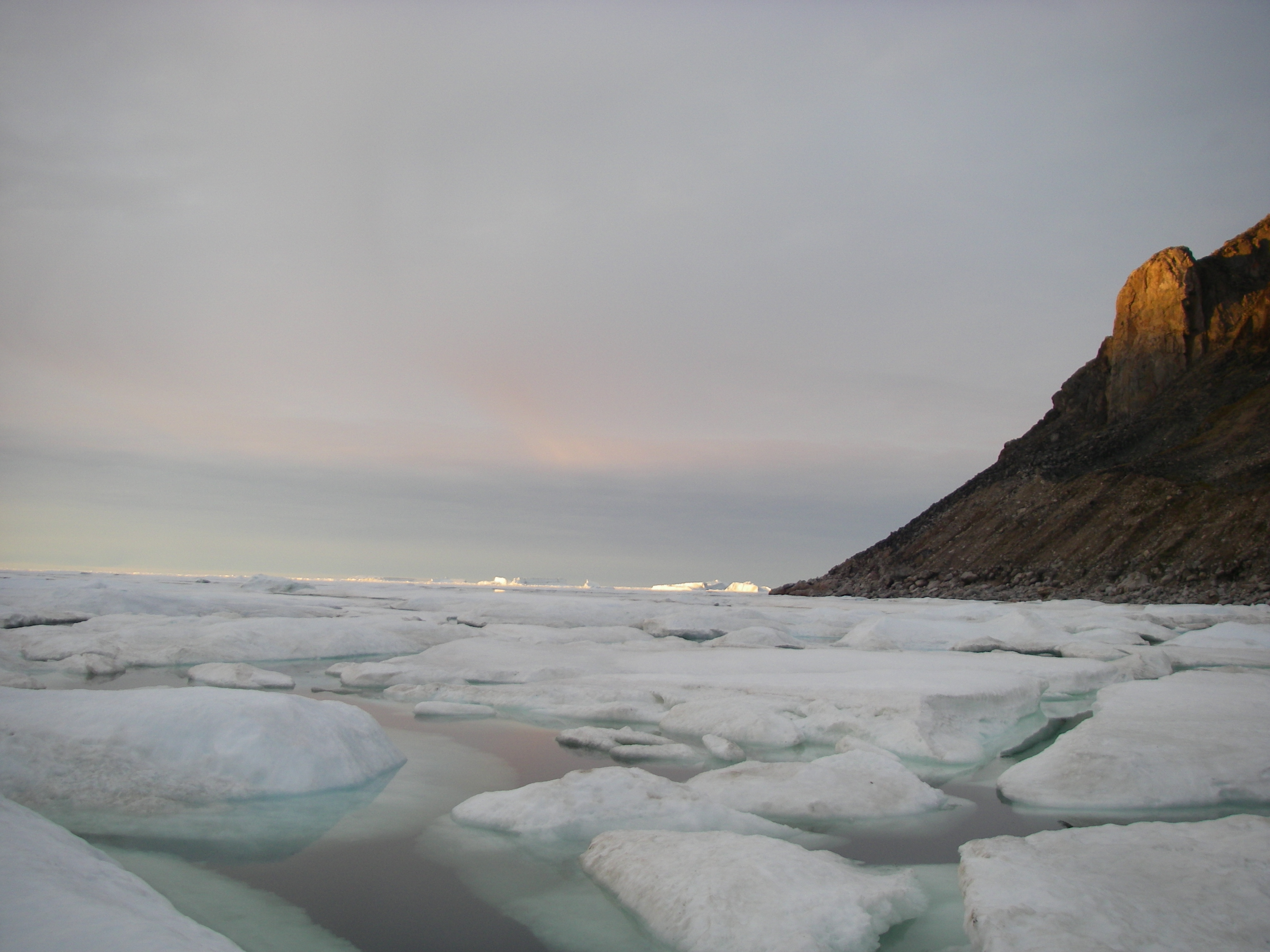 The Greenland Sea has begun to break up, leaving pools of water between islands of sea ice. Kap Hoegh, Greenland.