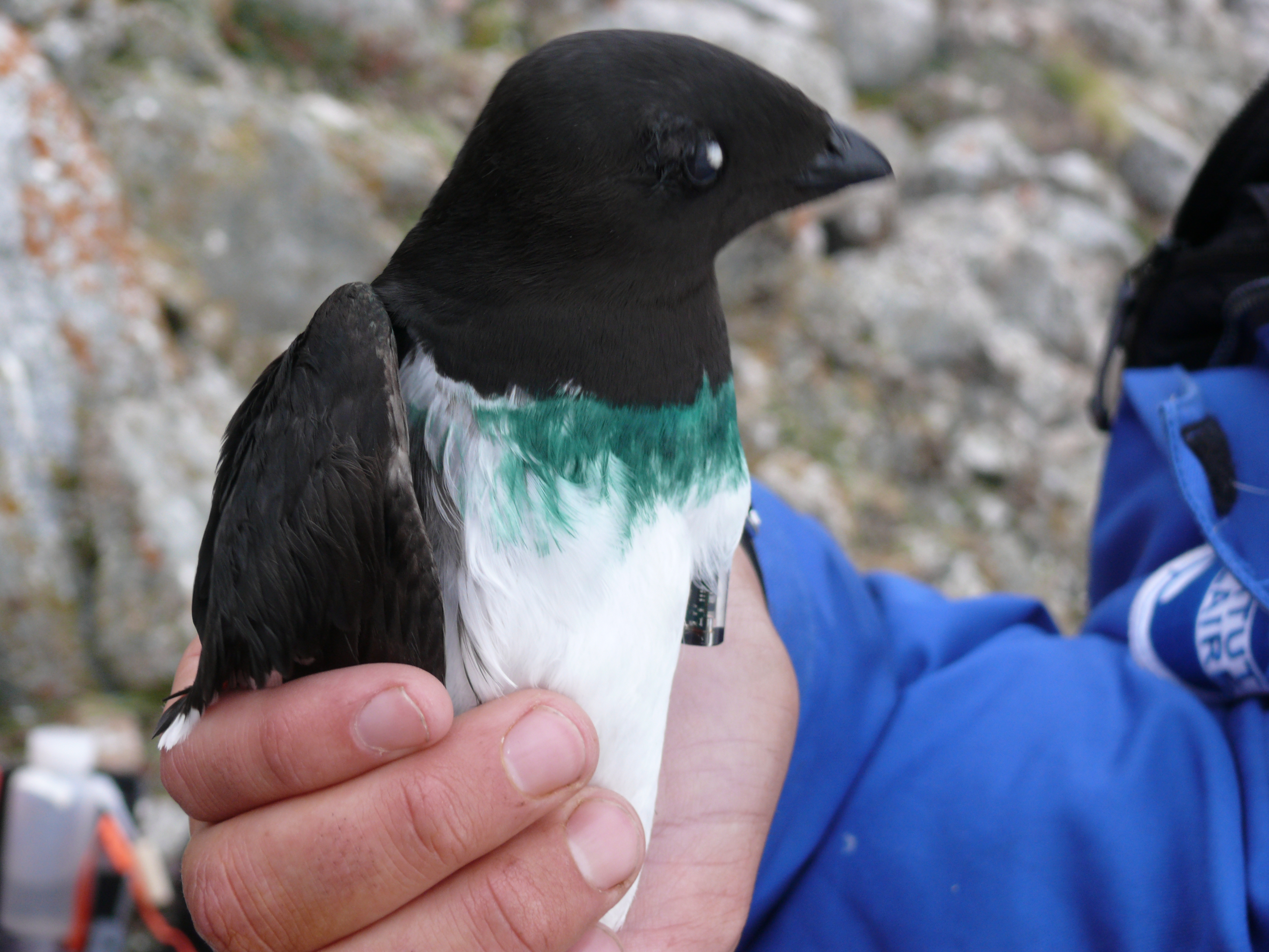 Freshly marked Little Auk whose color identifies the temperature/depth recorder that is glued to his chest. Kap Hoegh, Greenland.