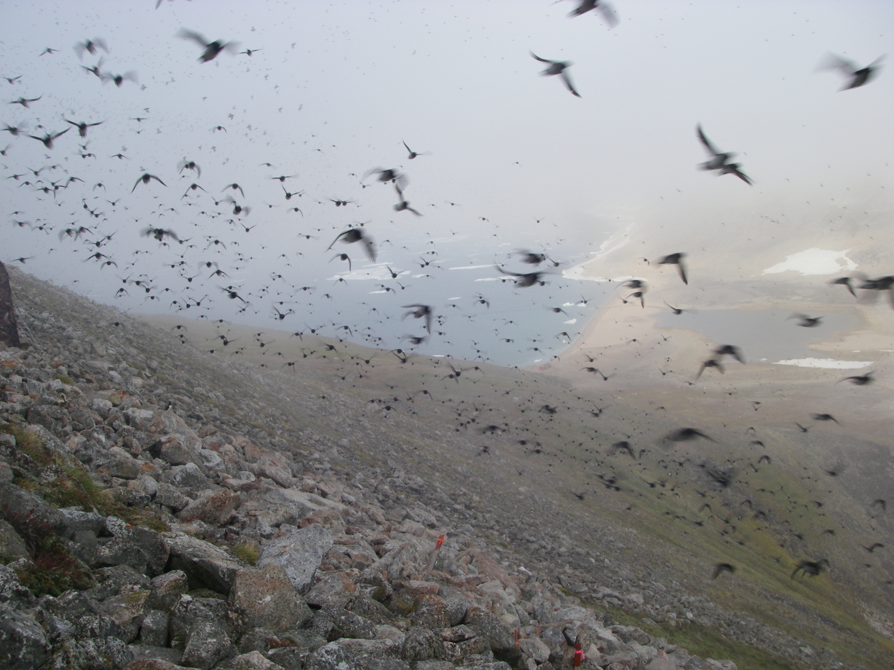 Little auks in flight over Kap Hoegh, Greenland.