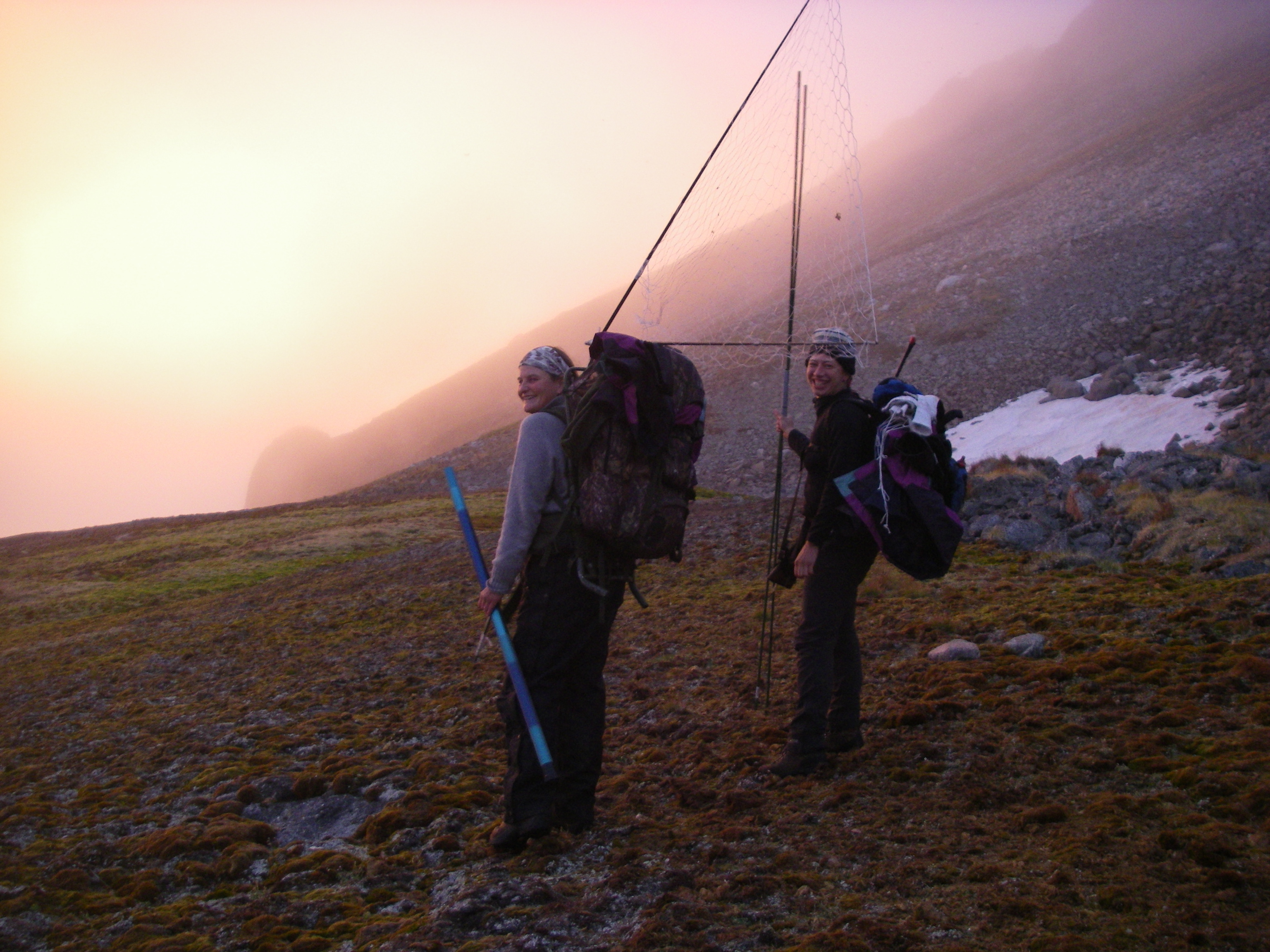 Ann Harding and Rachael Orben set out to recapture little auks using puffin nets, noose carpets, and mist nets at the little auk colony. Kap Hoegh, Greenland.