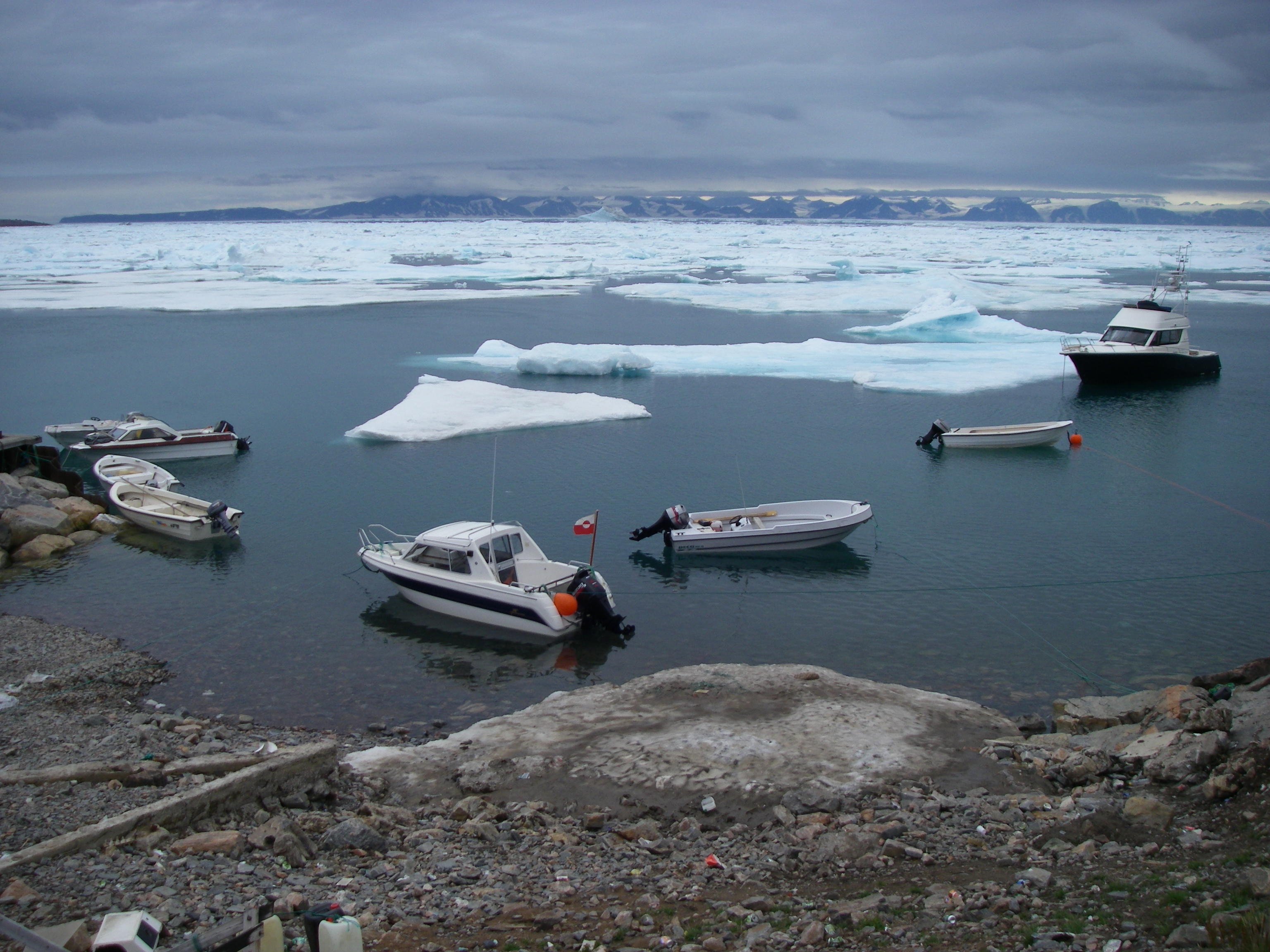 Local and foreign boats wait for the sea ice to move away so they can use the bay at Ittoqqortoormiit, Greenland.