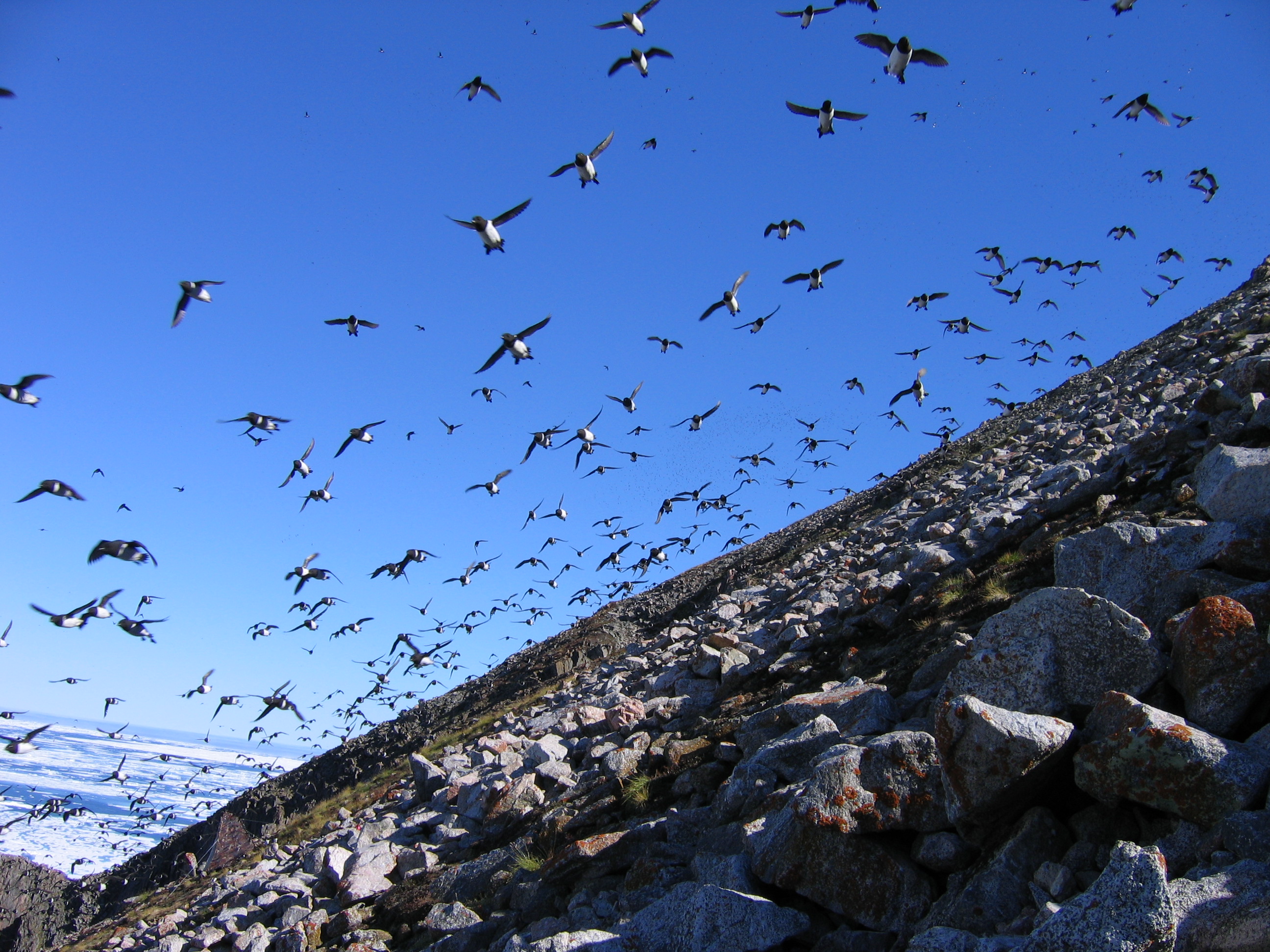Little auks soar over the little auk colony at Kap Hoegh, Greenland.