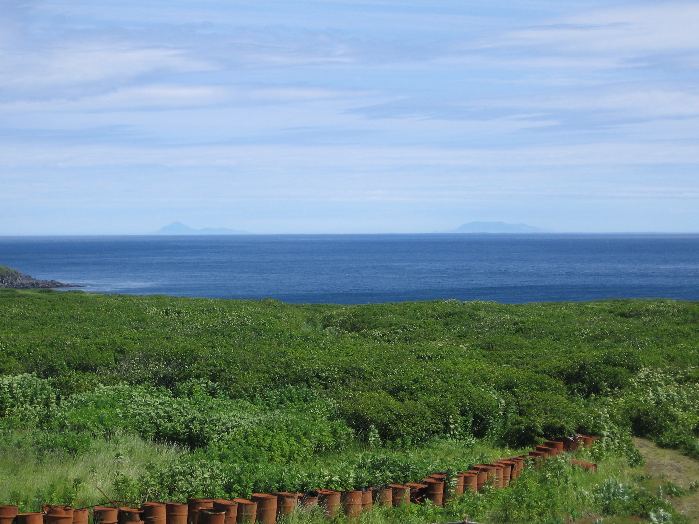 Far to the south, Shiashkotan and Ekarma Islands can be seen from Matua. Kuril Islands, Russia.