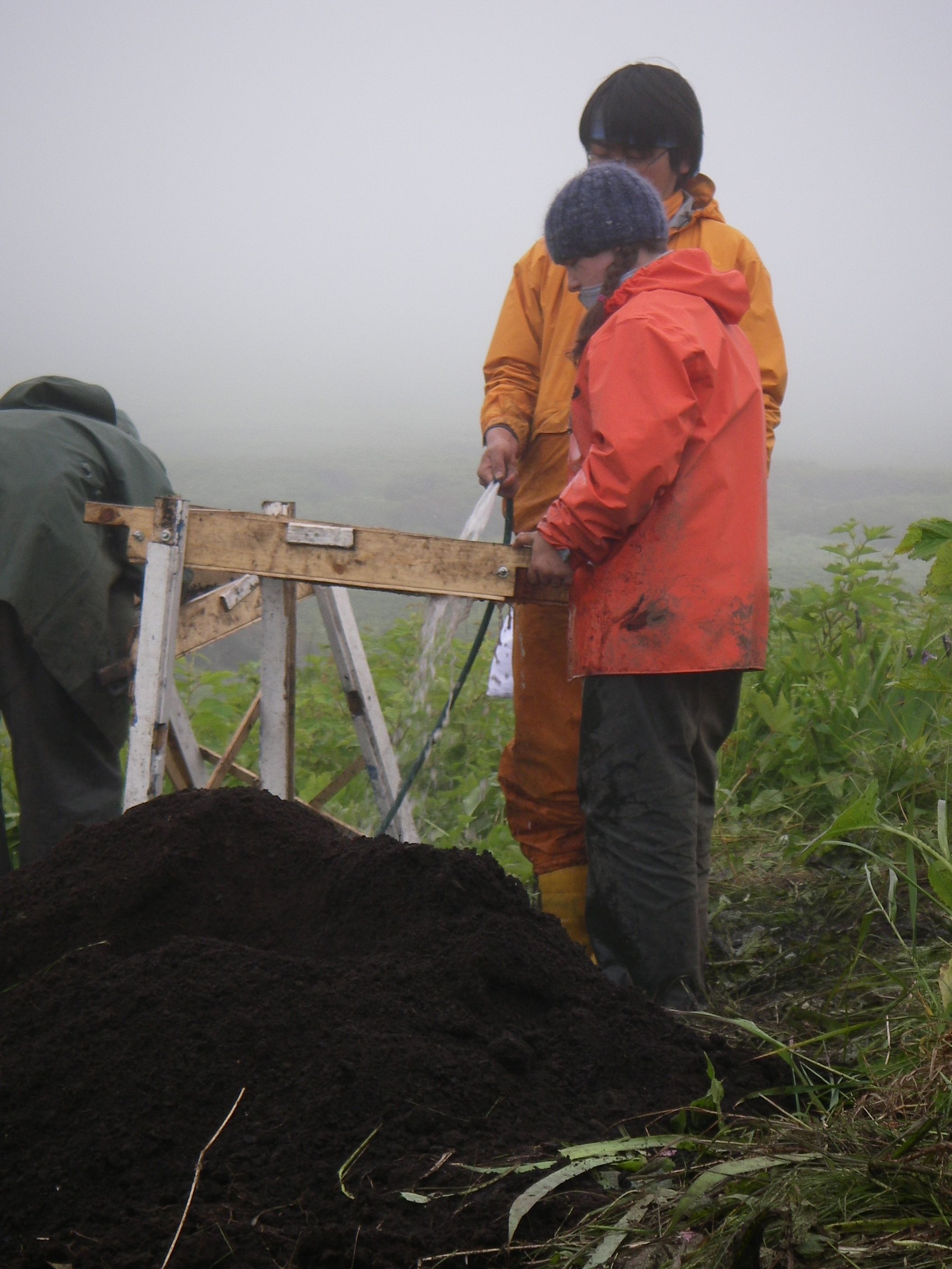 Misty Nikula digs in Unit 2 of the Vodapadnaya excavation. In order to not walk on other excavation units, she is hanging over the edge and reaching down about 50 to 70 cm to scrape and lift out the remaining dirt. Working in the background is Volodya Gulobtsov. Simushir, Kuril Islands, Russia.