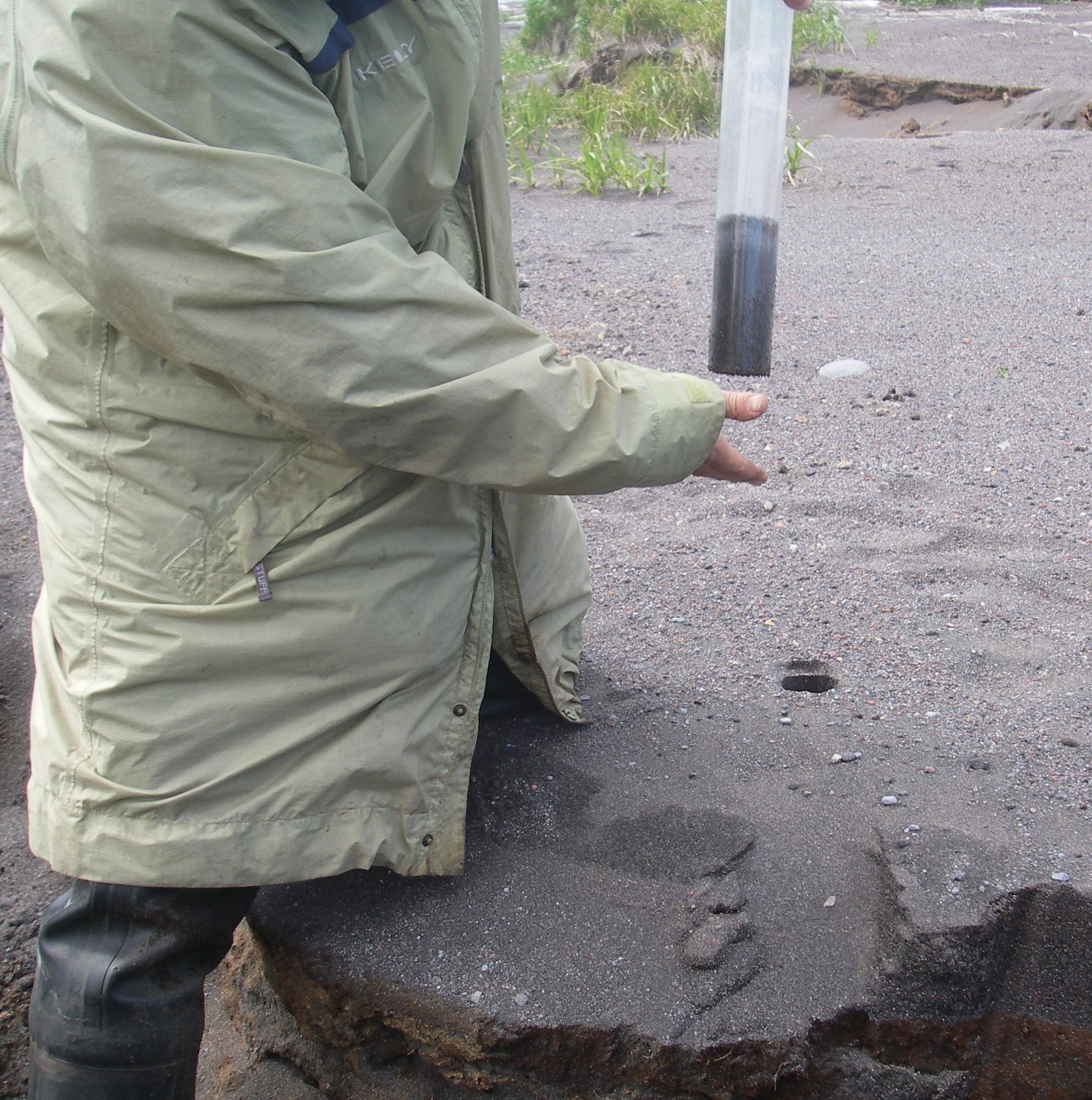 After the tube has been pushed about 0.5 - 1 cm into the soil beneath the tsunami deposit, it is twisted slightly and gently pulled up and out. The soil is more compact than the sand and helps to hold the sand inside the tube so that it can be measured and collected. Ainu Bay, Matua, Kuril Islands, Russia.