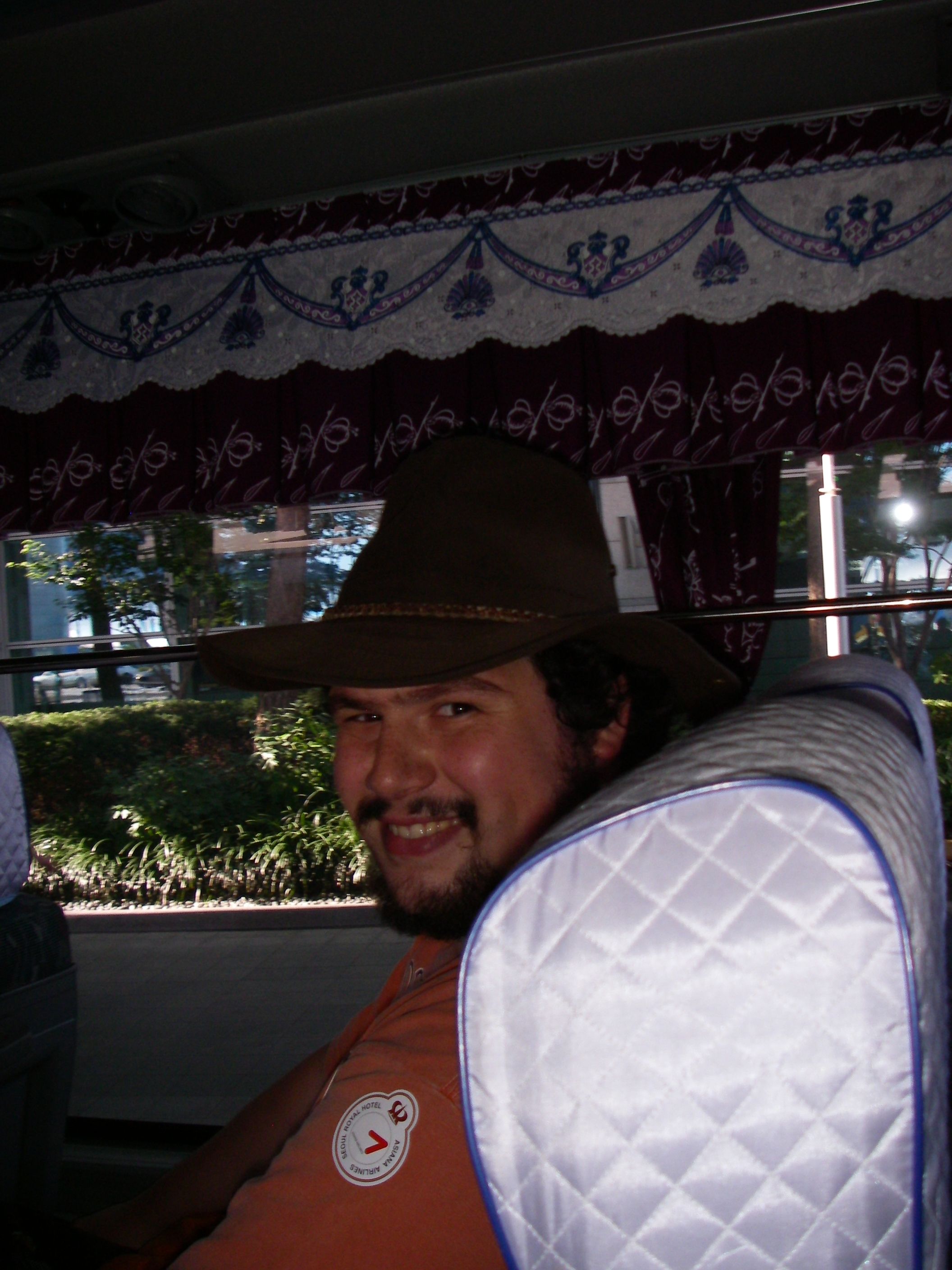 Nick Shankle on the shuttle bus from the Incheon Airport to the Seoul Royal Hotel. Note the fancy decorations!