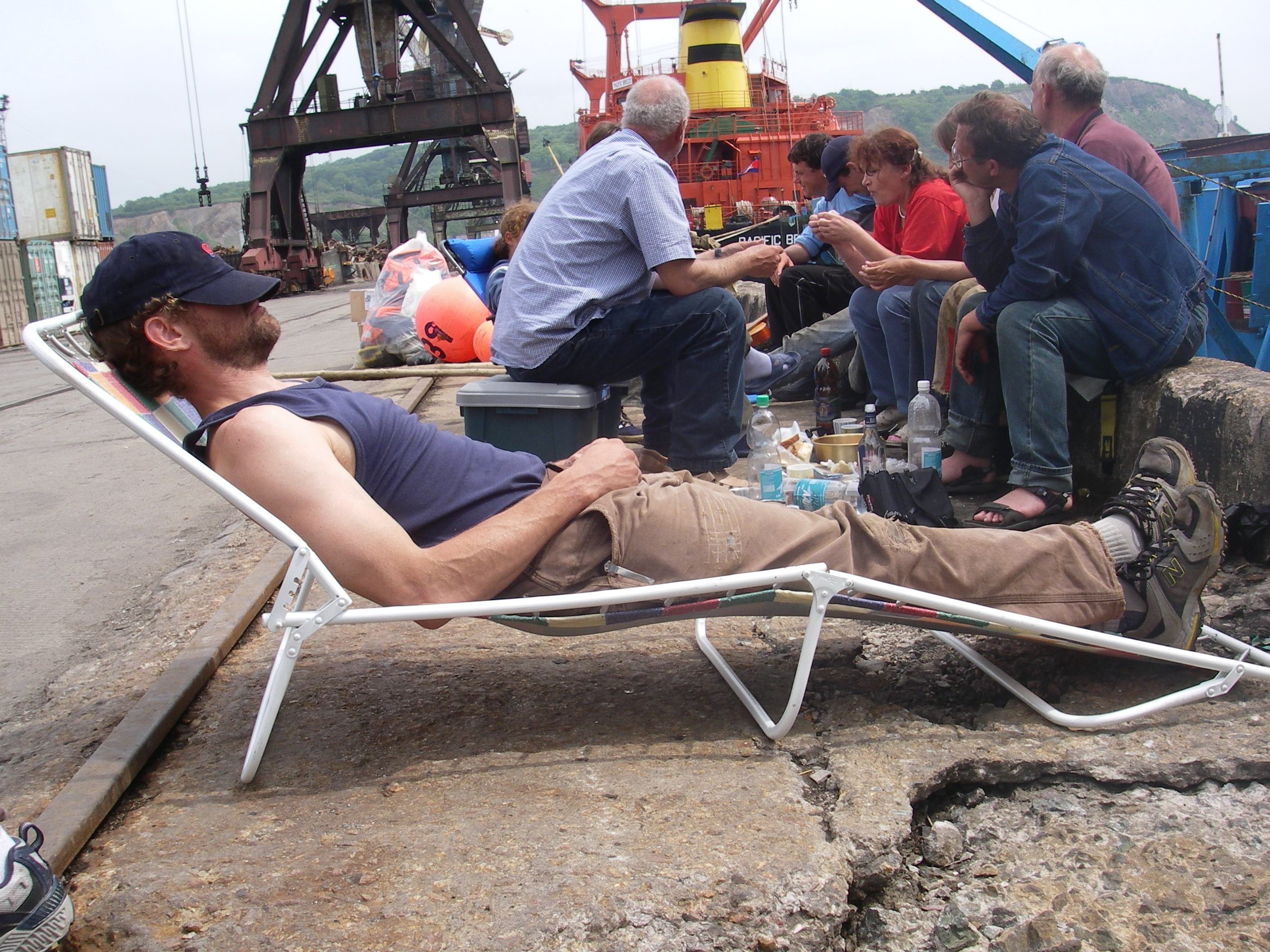 Mike Etnier takes a break from loading gear and waiting on the dock to “rest his eyes” on a warm and muggy overcast day in Korsakov, Sakhalin Island, Kuril Islands, Russia.