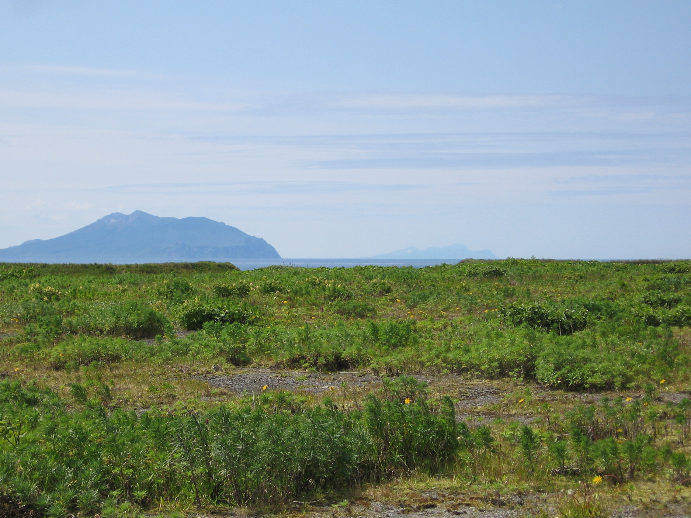 A view of Rasshua and Ketoy Islands to the south of Matua on a clear day. Kuril Islands, Russia.