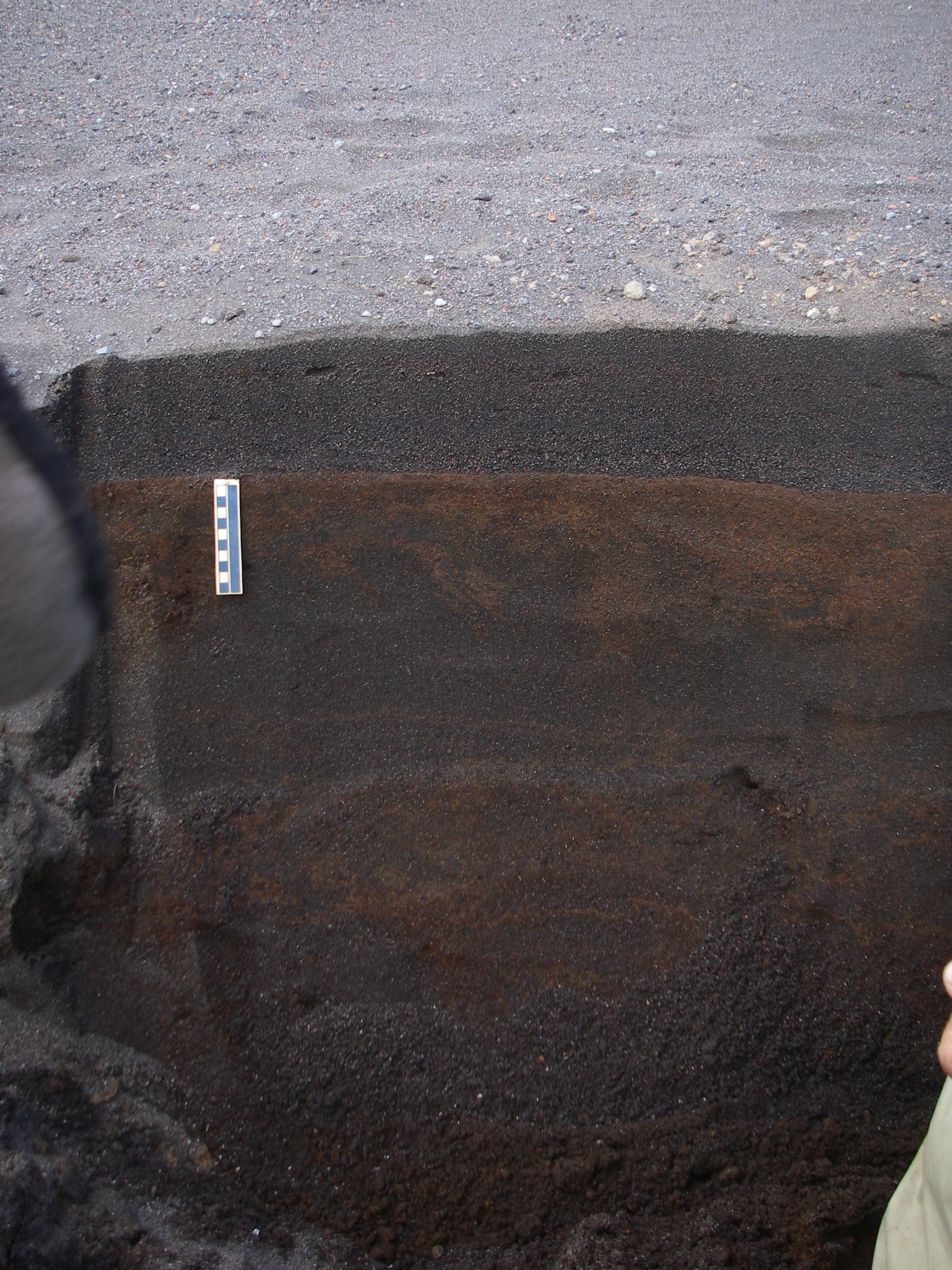 The 2006 tsunami deposit on top of previous stratified sand layers on the beach at Ainu Bay, Matua, Kuril Islands, Russia.