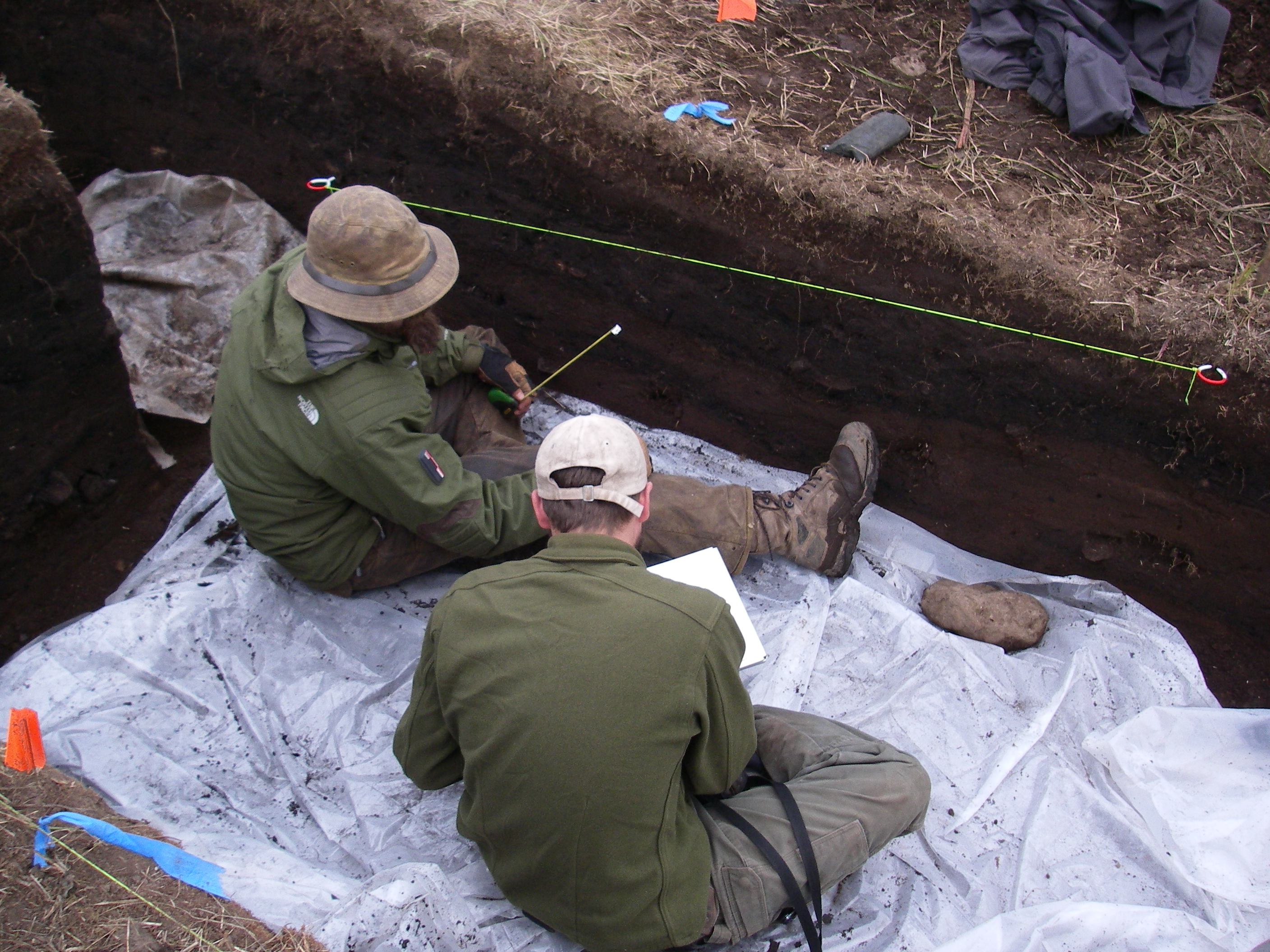 James Taylor and Matt Walsh work to draw an archaeological stratigraphic profile map of the north wall of Unit 1 at the Vodapadnaya excavation site. The yellow line along the wall has been leveled and measured against the secondary datum point so that the depths of each layer can be matched up to others on each drawing. Simushir, Kuril Islands, Russia.