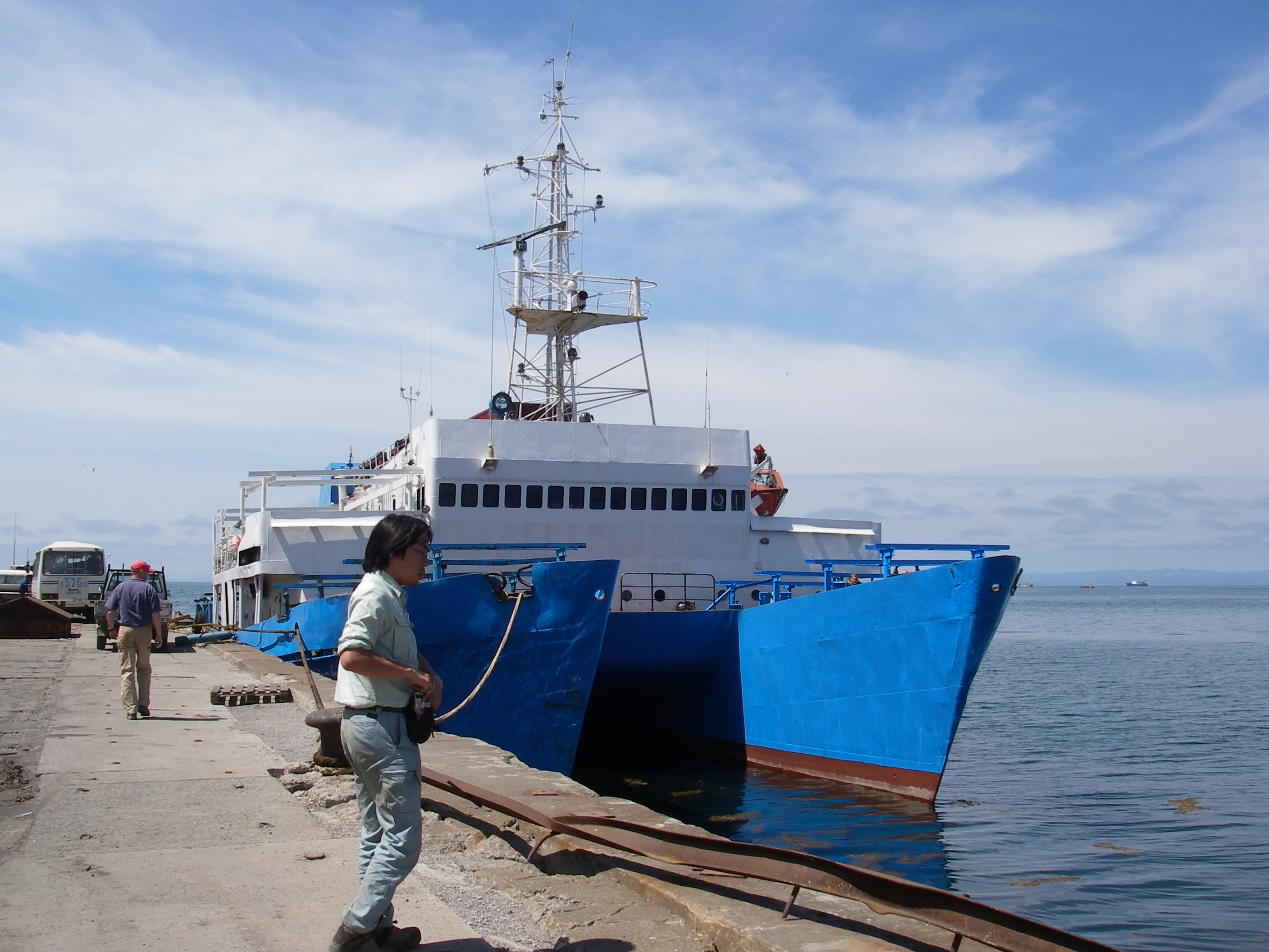 Our first view of the Iskatel-4, a Russian catamaran vessel that will take us to the Kuril Islands. Iskatel means "Seeker" in Russian. Korsakov, Sakhalin Island, Russia.