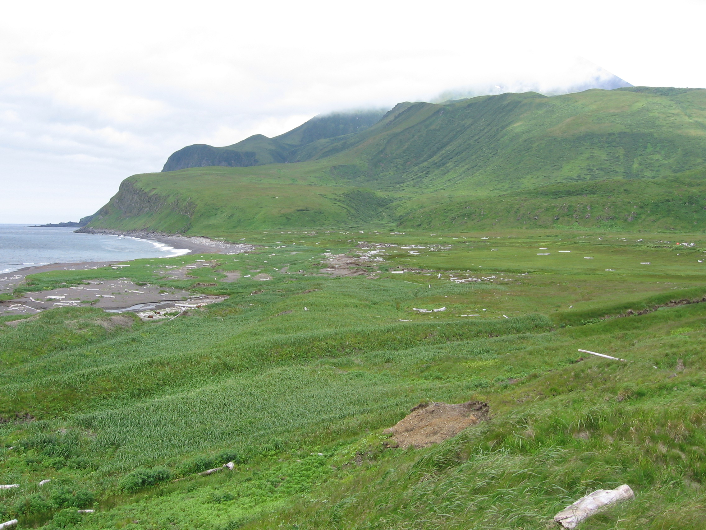 Ainu Bay, Matua on August 6, 2007 from the side of a hill to the south of the bay. The Bay has been altered dramatically by tsunamis created by the November 2006 and January 2007 earthquakes off the Pacific coast of the Kuril Islands chain in Russia.