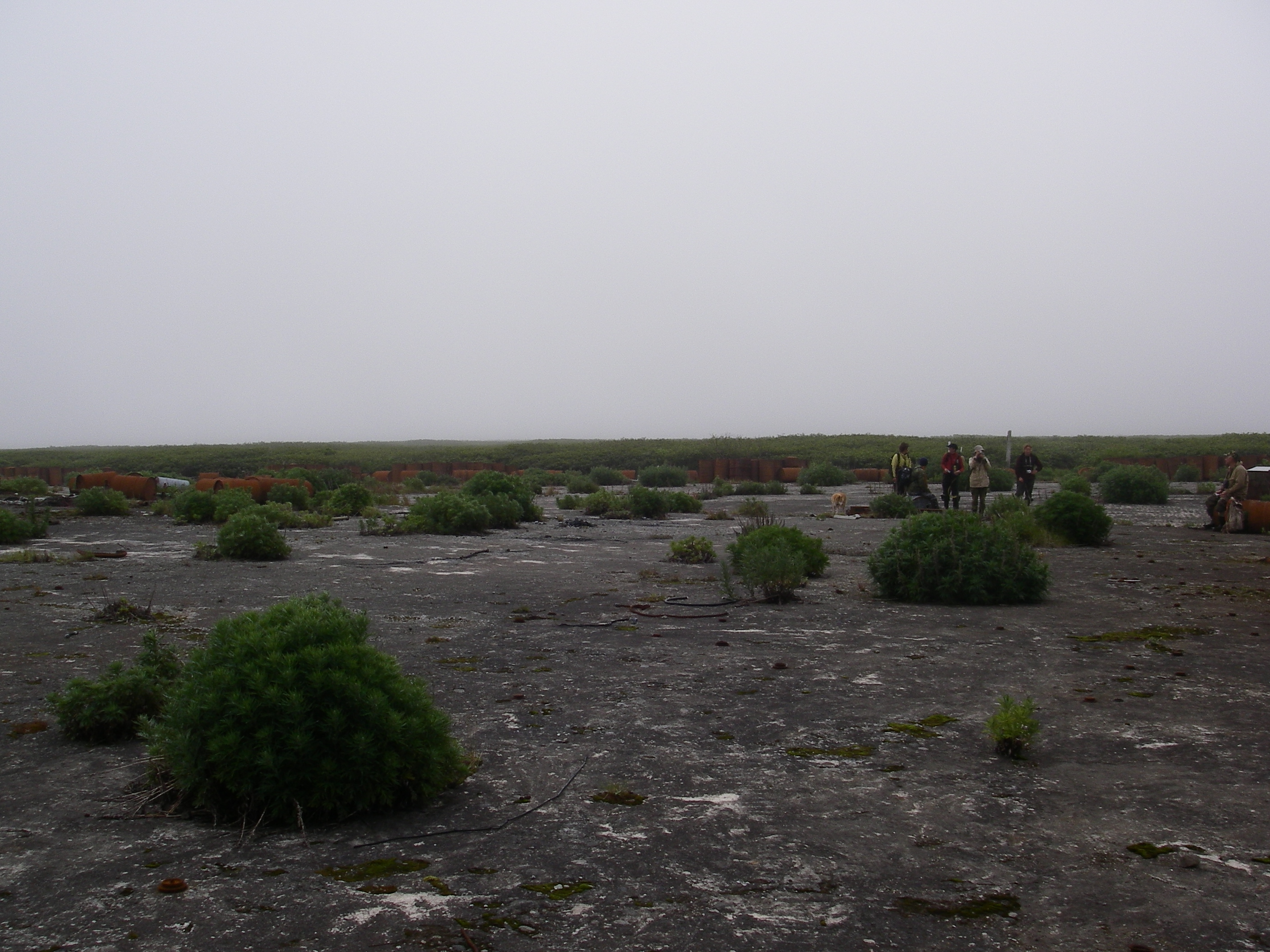 We pause for a brief rest from our hike at an old WWII-era airstrip midway across Matua that is littered with rusty barrels. Kuril Islands, Russia.