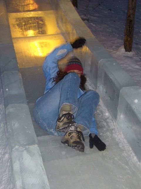 Misty Nikula slides down the kiddie ice slide at the World Ice Art Championships in Fairbanks, Alaska.