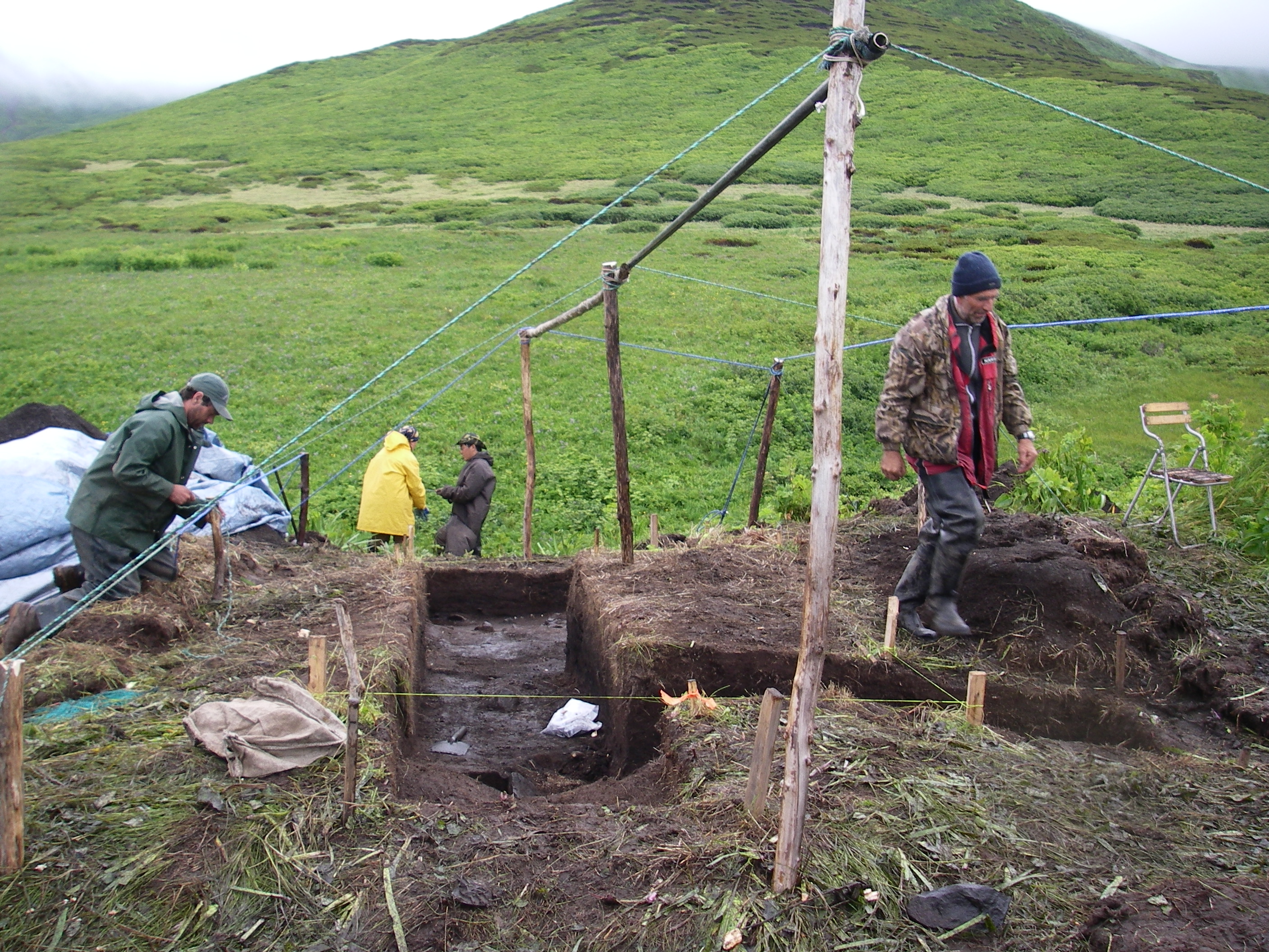 Working to build the frame for the tarp tent shelter so that we can work out of the wind and rain at the Vodapadnaya excavation site, Simushir, Kuril Islands, Russia. Pictured are Ben Fitzhugh, Natasha Toropova, Dima Chvagian and Volodya Gulobtsov.