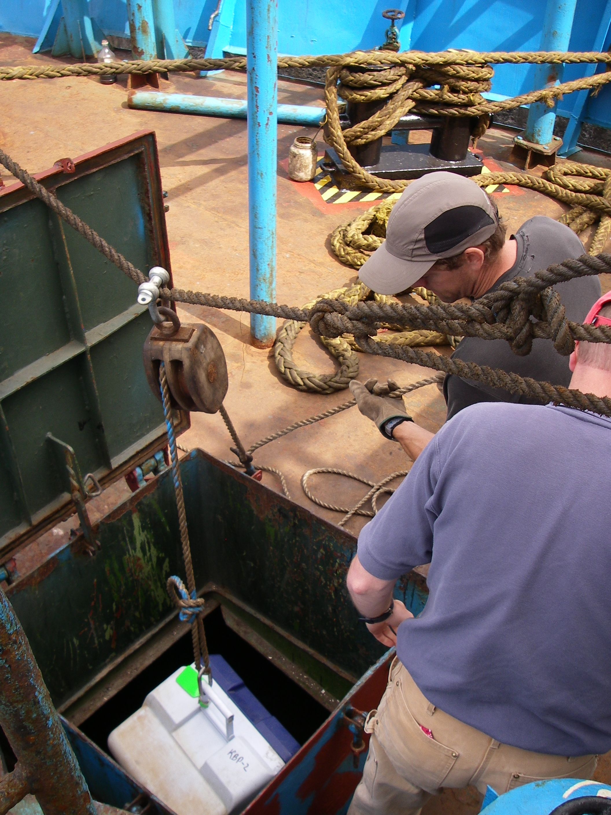 Mike Etnier (left) and Colby Phillips (right) use a pulley to help lower gear down to the hold on board the Iskatel-4. Korsakov, Sakhalin Island, Russia.