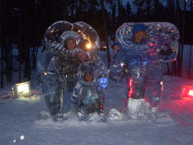 Brandon Gillette, Mindy Bell, and Anne Linsley have fun at the kiddie park portion at the World Ice Art Championships in Fairbanks, Alaska.