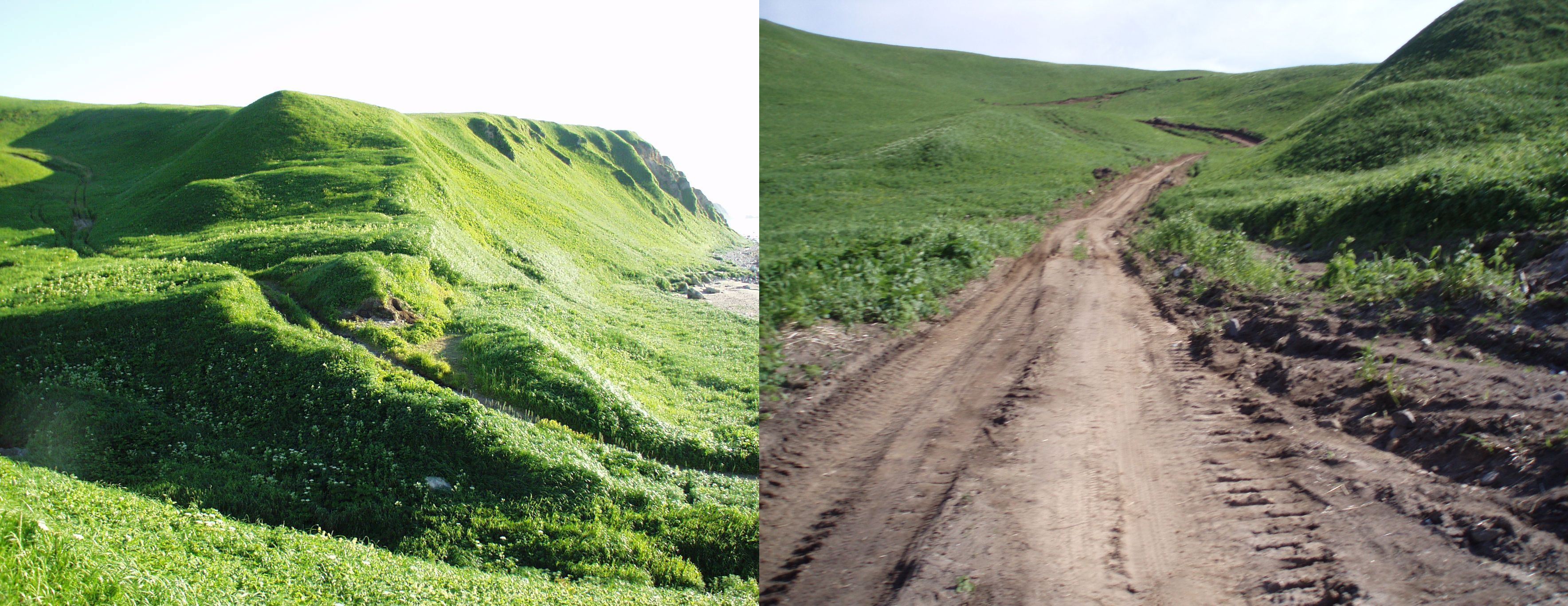 Right: The Ainu Creek excavation site as it was found in 2007. The road has been significantly widened by bulldozing and the archaeological site is significantly disturbed. Ainu Creek, Urup Island, Kuril Islands, Russia.