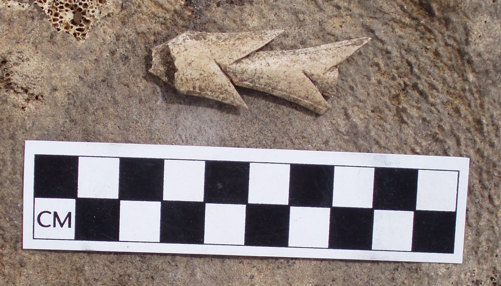 A bilaterally barbed bone harpoon point uncovered at the Ainu Creek archaeological site, Urup Island, Kuril Islands, Russia.