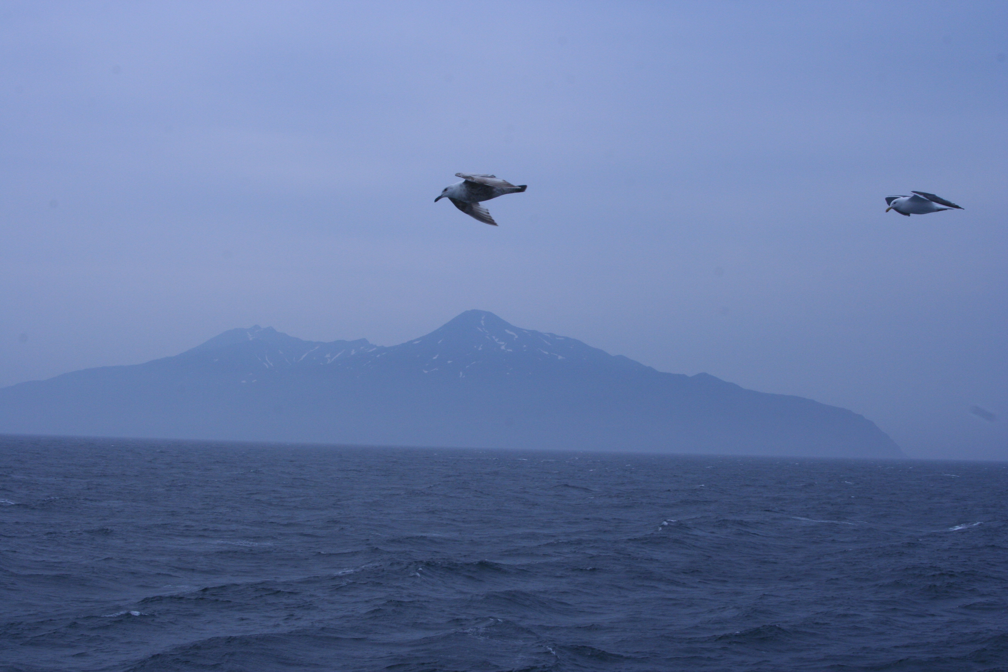 Seagulls flying alongside the Iskatel as we pass Chirip Volcano, located on the northeastern end of Iturup Island. Sea of Okhotsk, near Iturup, Kuril Islands, Russia