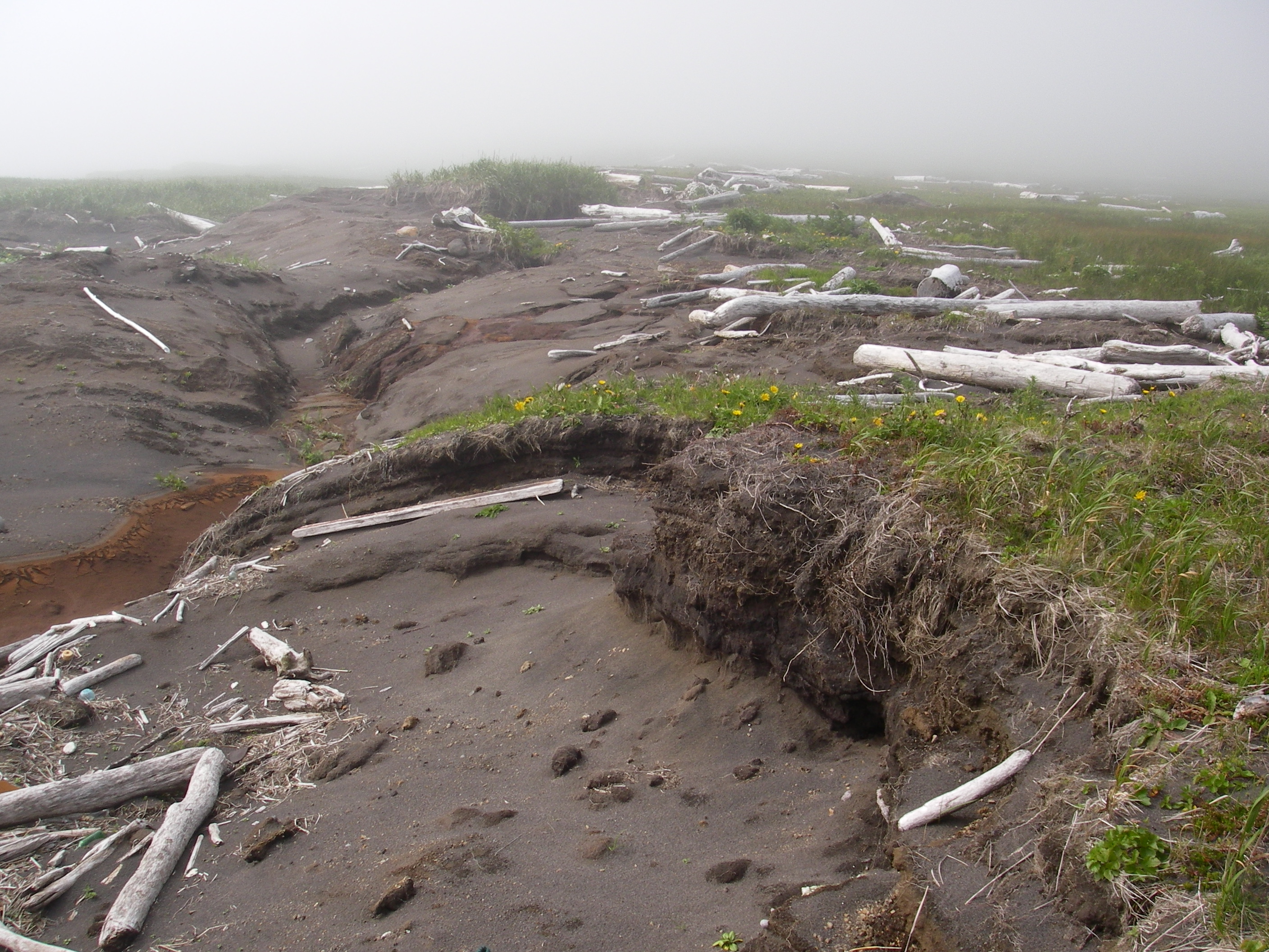 Deep erosional grooves cut in the beach ridges at Ainu Bay by the 2006 and 2007 tsunamis. Matua, Kuril Islands, Russia.