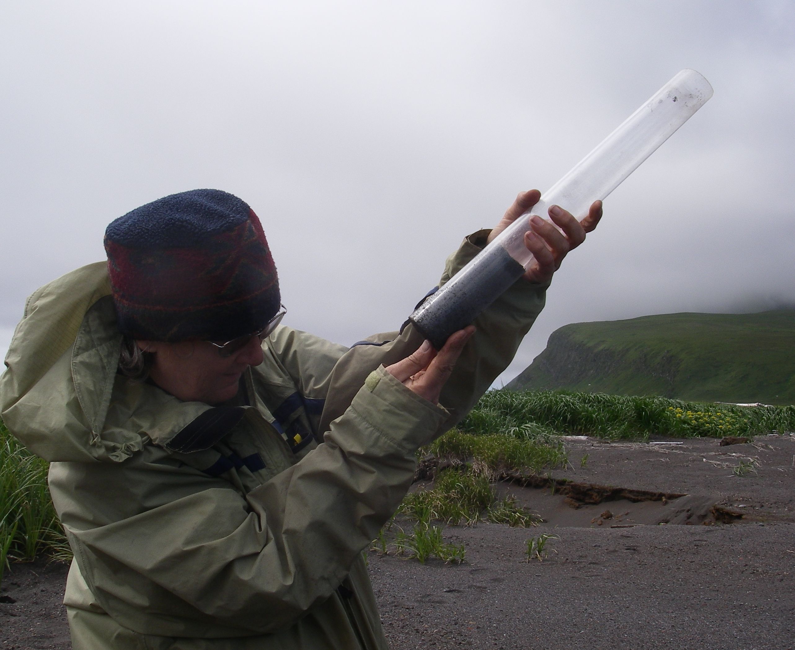 Jody Bourgeois checks the “soil seal” on the bottom of the tube to be sure that all of the tsunami deposit was collected. This particular sample was also preserved by cutting down the tube and capping both ends so that the stratigraphy of the deposit could be studied later. Ainu Bay, Matua, Kuril Islands, Russia.