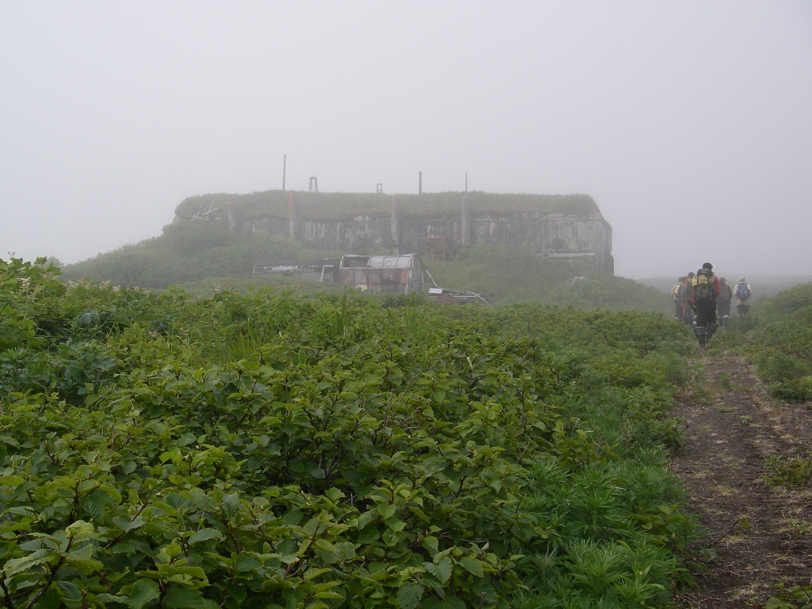 The group walks past a Japanese WWII-era bunker on the foggy hike from the Pacific Ocean side of Matua to the Sea of Okhotsk side. Matua, Kuril Islands, Russia.
