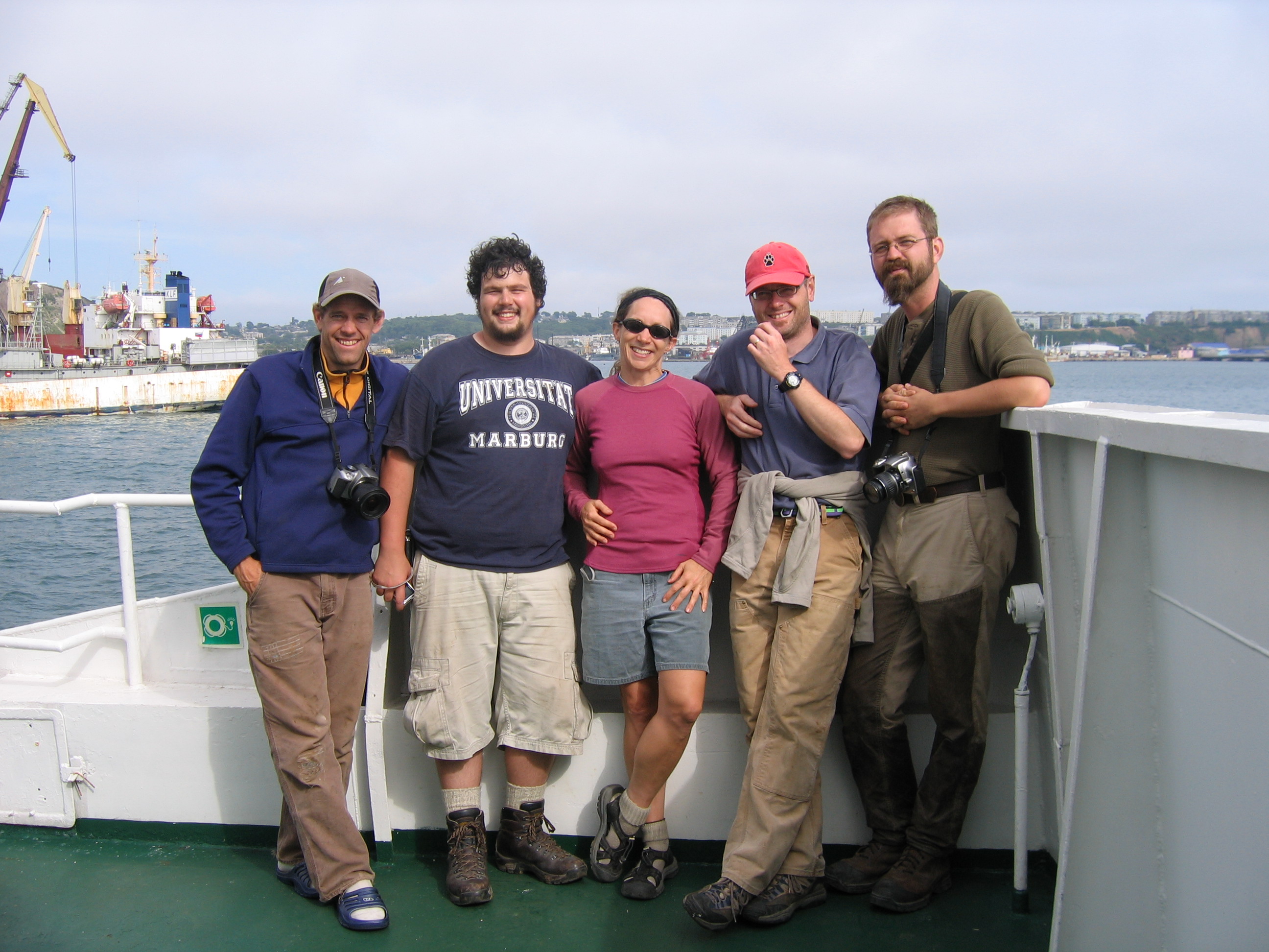 Mike Etnier, Nick Shankle, Misty Nikula, Colby Phillips, and James Taylor aboard the Iskatel-4 on the afternoon that they set out for the Kuril Islands. Korsakov, Sakhalin Island, Russia.