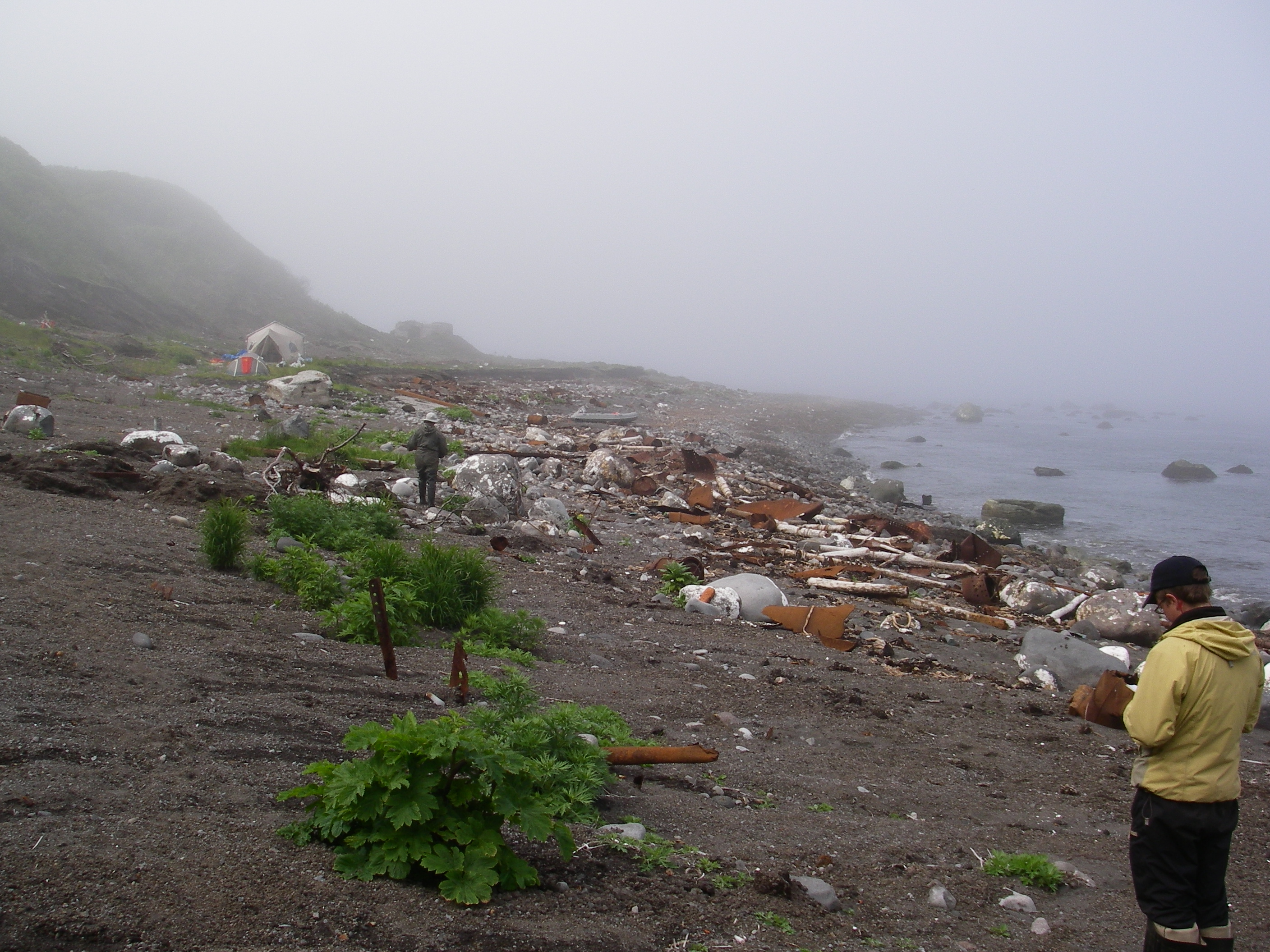 A view toward our camp on Matua from the south. On this end of the beach the exposed military equipment is even more significant. In addition, some of the rocks that are here – like the one that Jody Bourgeois is standing next to in the middle of the picture – are covered with bryozoans and seaweeds that grow beyond the low tide line, indicating that they have been pushed a great distance by the force of the tsunami wave. Matua, Kuril Islands, Russia.