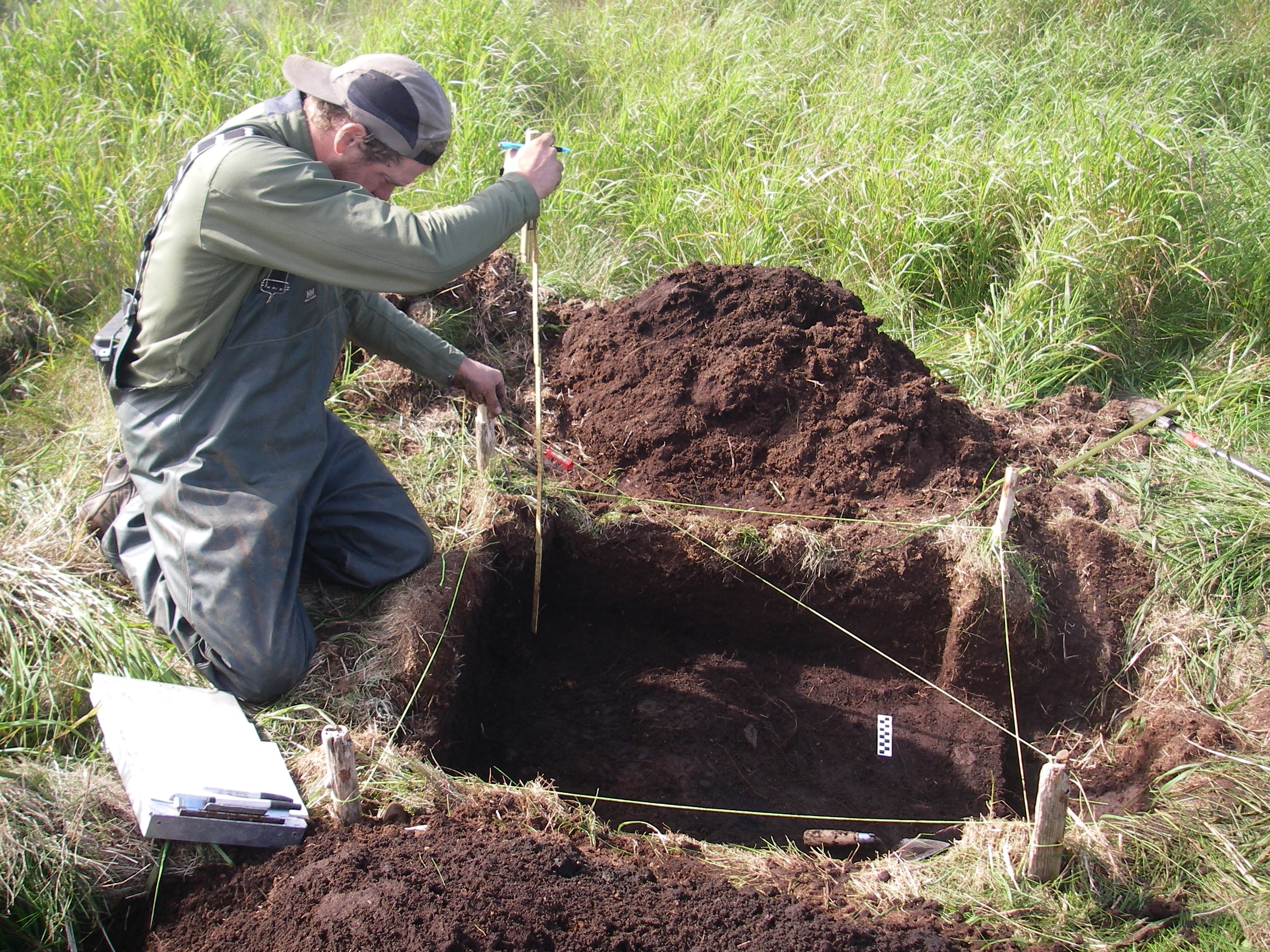 Mike Etnier measures the depth at the corners when Level 2 of Unit 1 at the Ryponkicha 1 excavation site is finished. After each level is completed, we measure how deep the corners and middle are below the surface, and record this on the unit-level form. Ryponkicha, Kuril Islands, Russia.