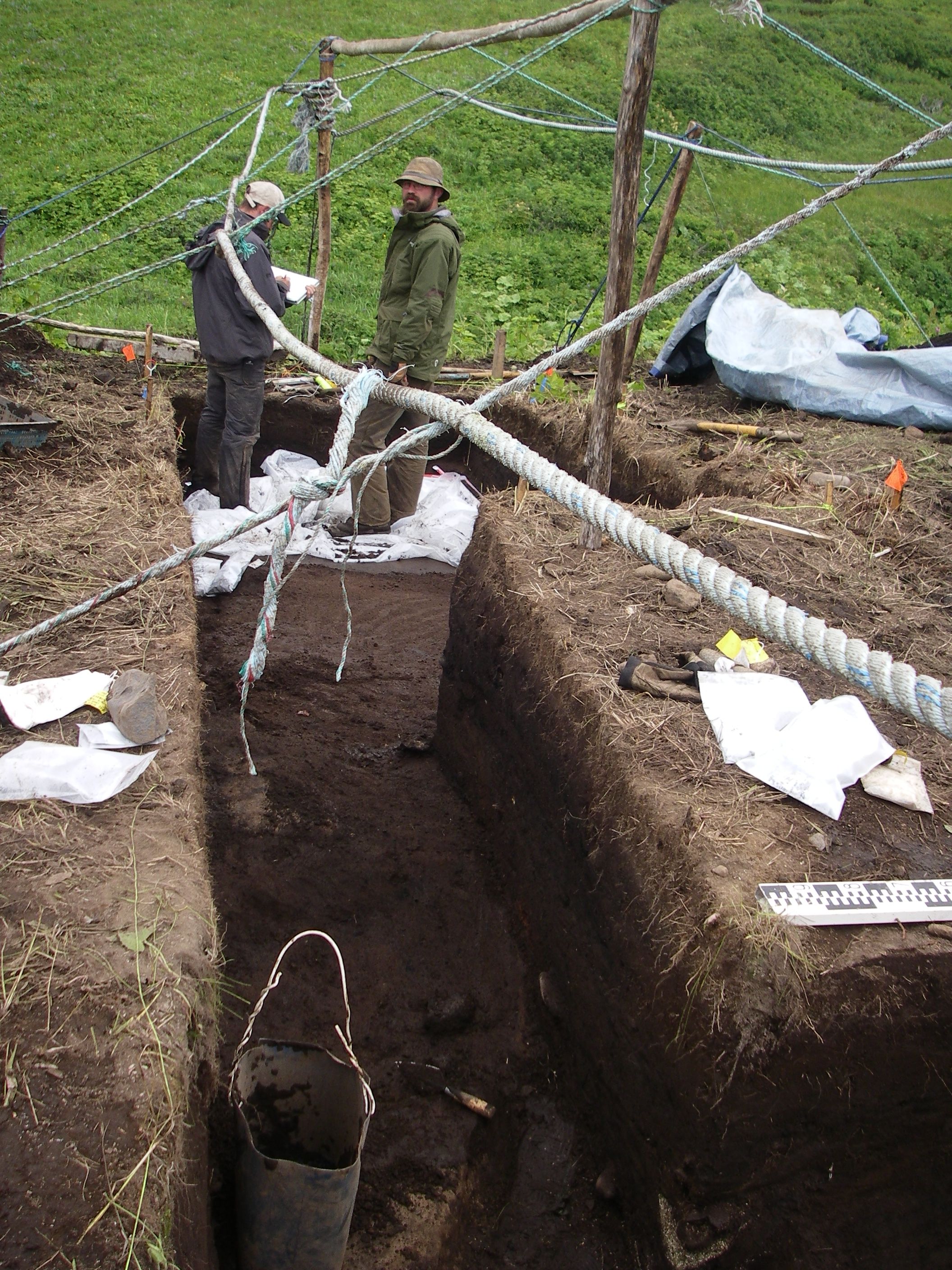 Matt Walsh and James Taylor standing in Unit 3 at the Vodapadnaya excavation site on the last day of digging, July 30. Simushir, Kuril Islands, Russia.
