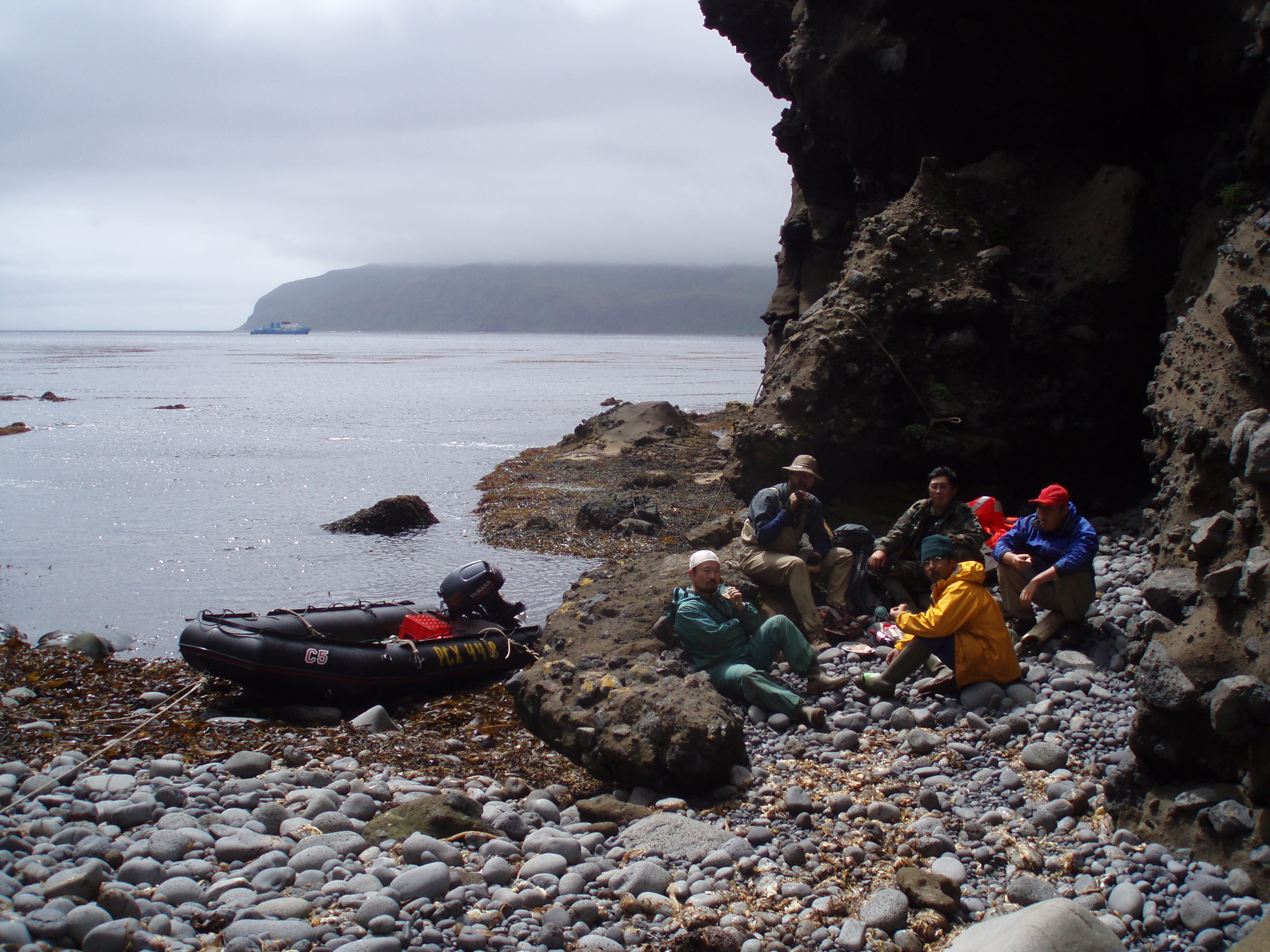 A view of the Iskatel coming into view between the barrier rocks of the sheltered grotto as Misty Nikula and the team ate a late lunch. From left to right: Yoshihiro Ishizuka, James Taylor, Dima Chvagian, Mitsuhiro Nakagawa, and Ahira Baba. Shiashkotan, Kuril Islands, Russia.
