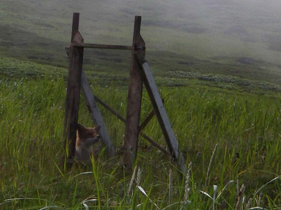A red fox checks out the ¼” screen that we use to recover archaeological materials from excavated sediments. Drobnyye, Shiashkotan, Kuril Islands, Russia.