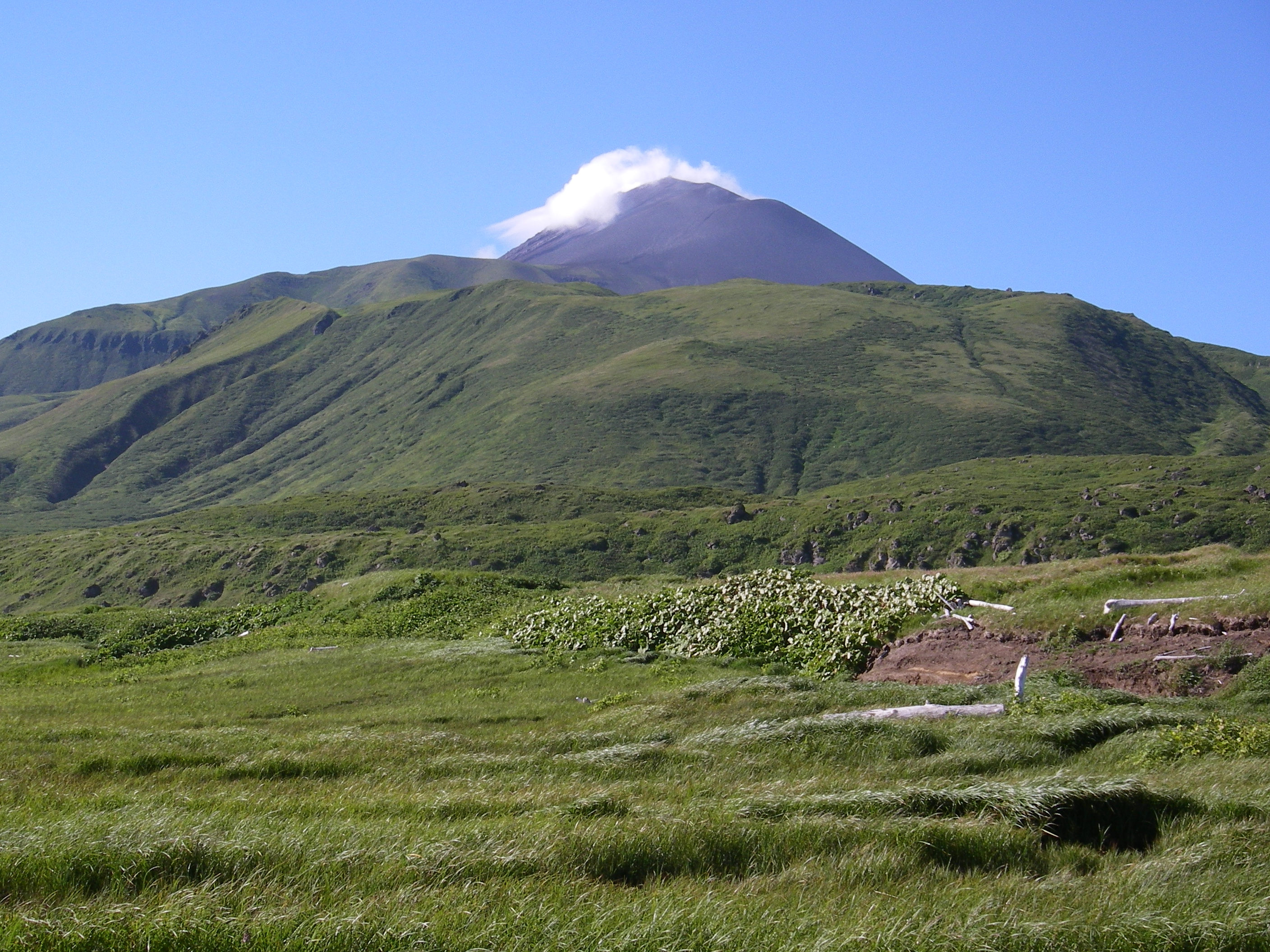 Sarychev Peak rises majestically over Ainu Bay on a clear day on Matua. This is the Kuril Islands’ most active volcano. You can see that the rain filtering down from the typhoon the previous day is still being “steamed off”. Matua, Kuril Islands, Russia.