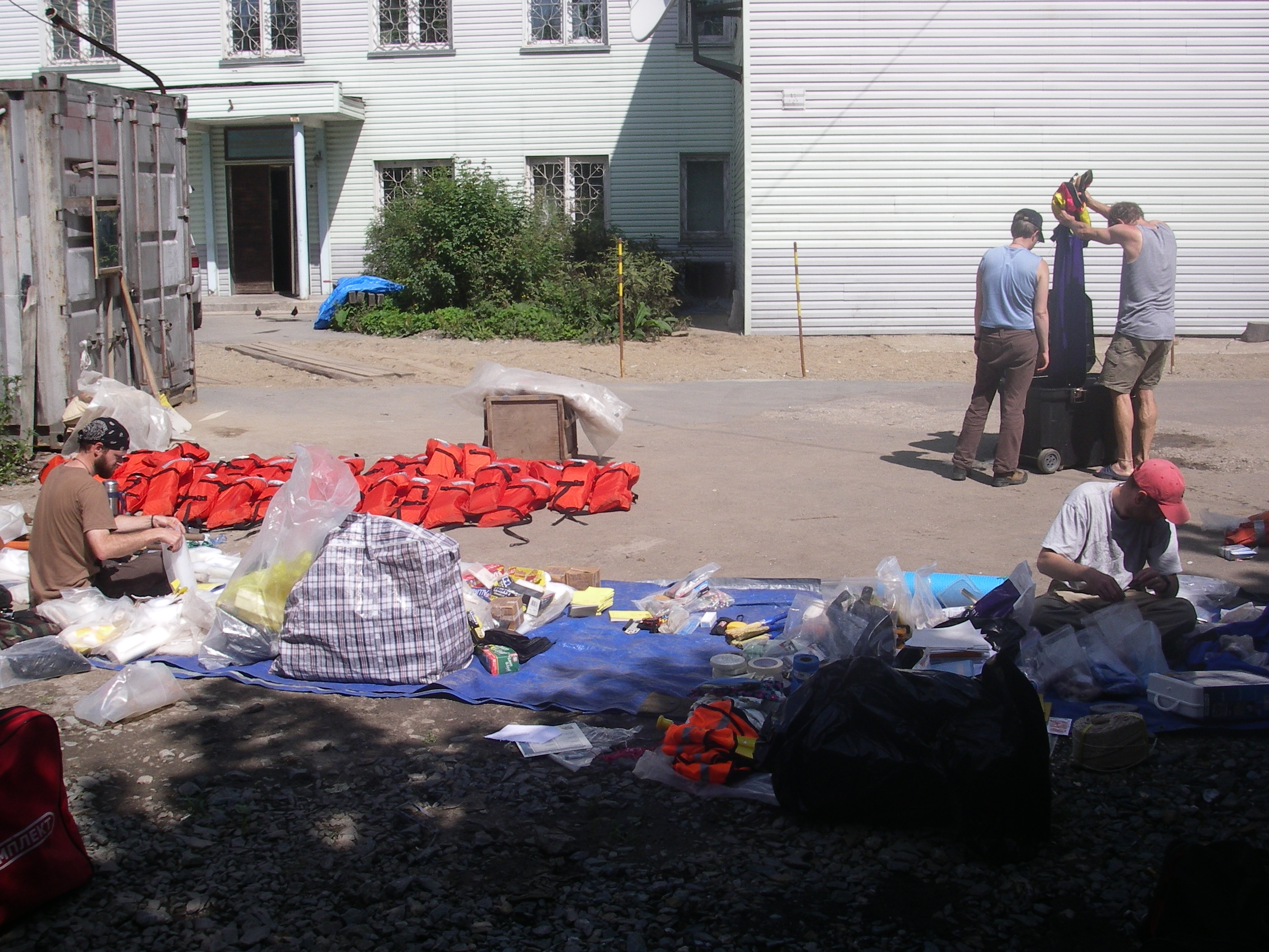The crew works to sort, organize, clean and prepare, count and then inventory and repack the group field equipment that will be stored at the Sakhalin Regional Museum until next summer. Matt Walsh is sorting and counting sample bags, Colby Phillips is organizing and inventorying first aid supplies, and Bre MacInnes and Mike Etnier are washing Bre’s dry suit. Yuzhno-Sakhalinsk, Sakhalin Island, Kuril Islands, Russia.