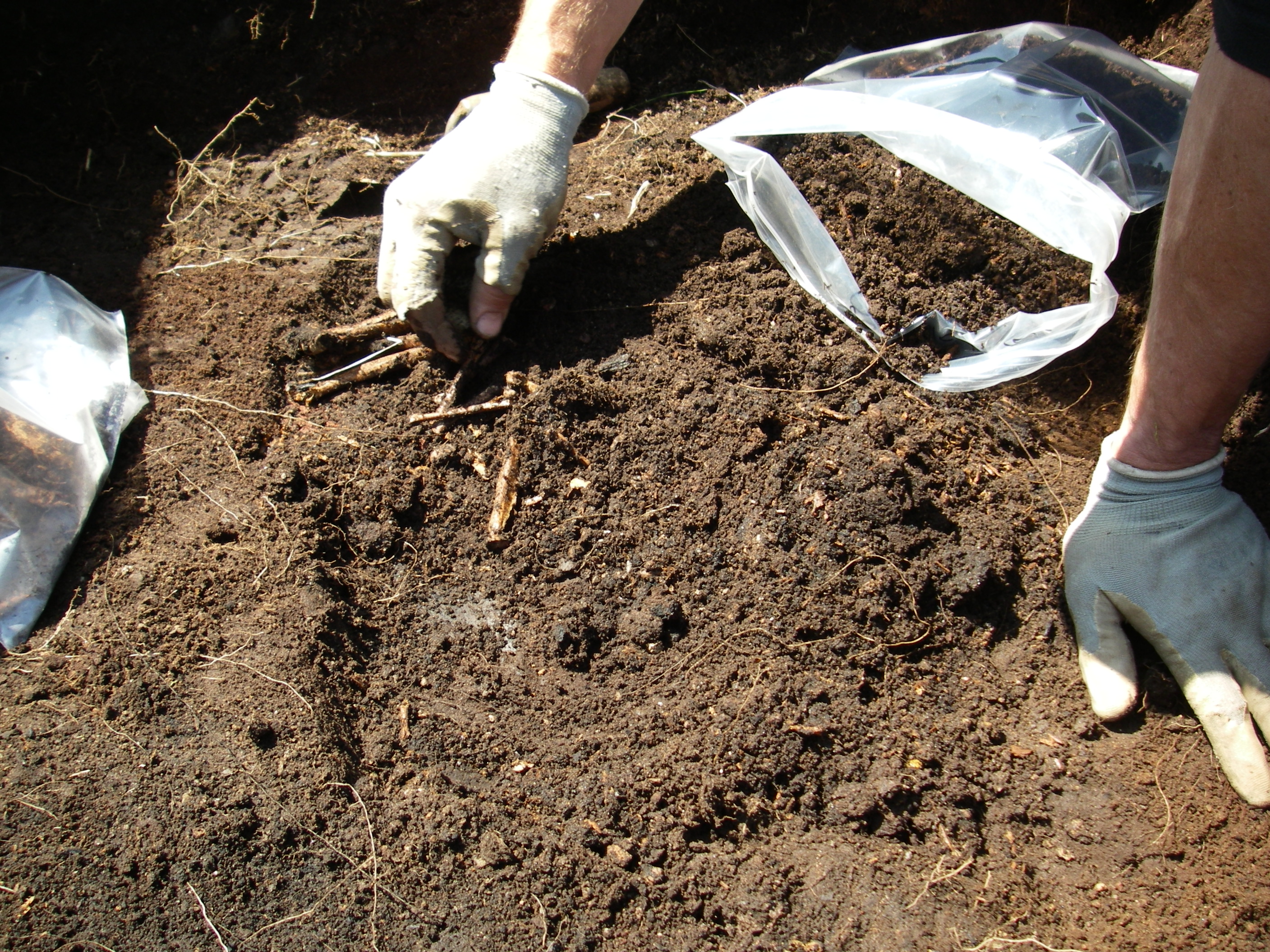 Mike Etnier picks out some of the larger pieces of bone, probably from an albatross, at the Ryponkicha excavation site. These were found about 50 centimeters below the surface. Ryponkicha, Kuril Islands, Russia.