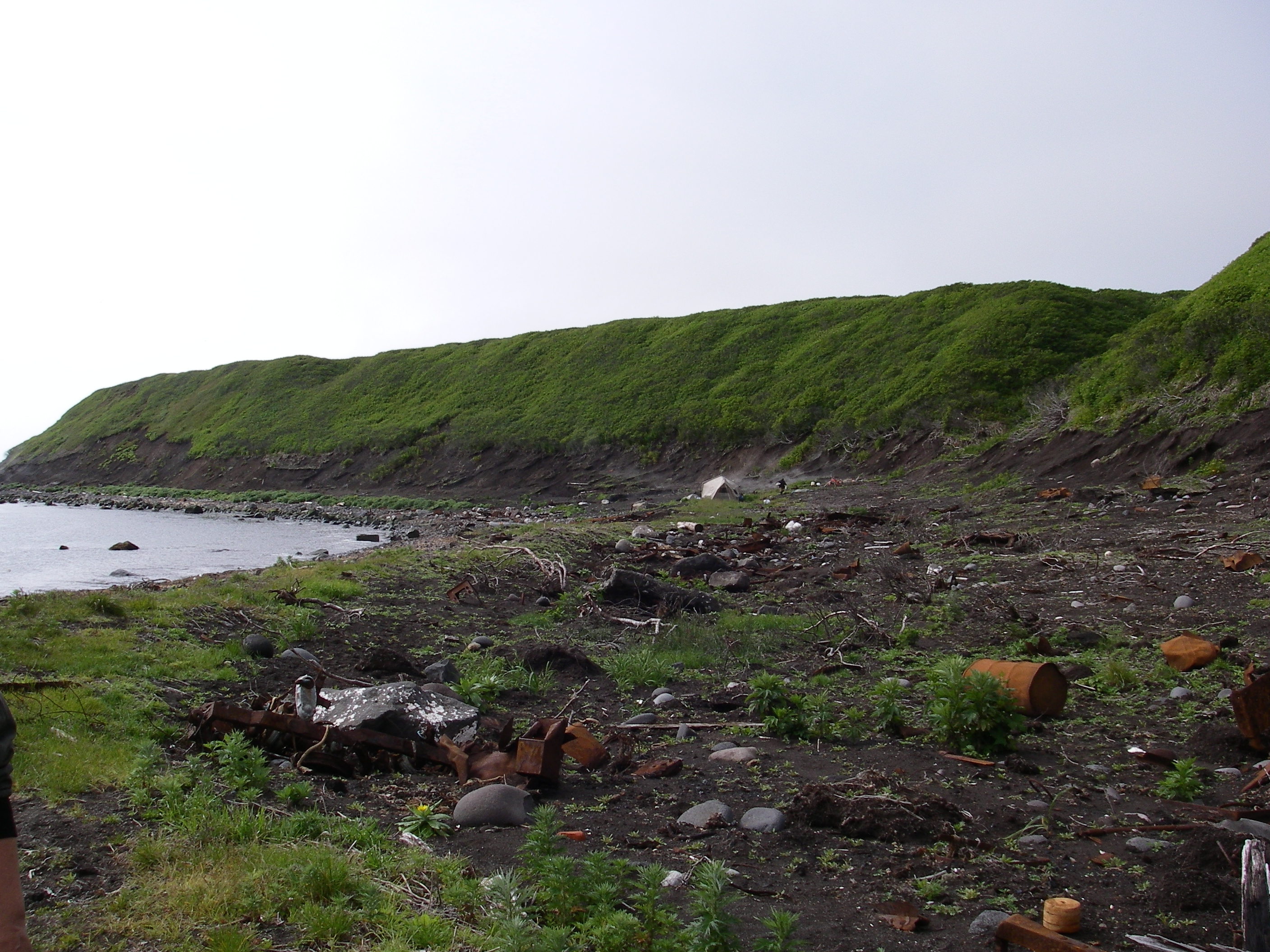 A view toward our camp on Matua from the north. Along the beach you can see the now-exposed rusted remains of World War II era military equipment. Along the terrace you can see the area of erosion that gives an indication of the tsunami’s height. Matua, Kuril Islands, Russia.
