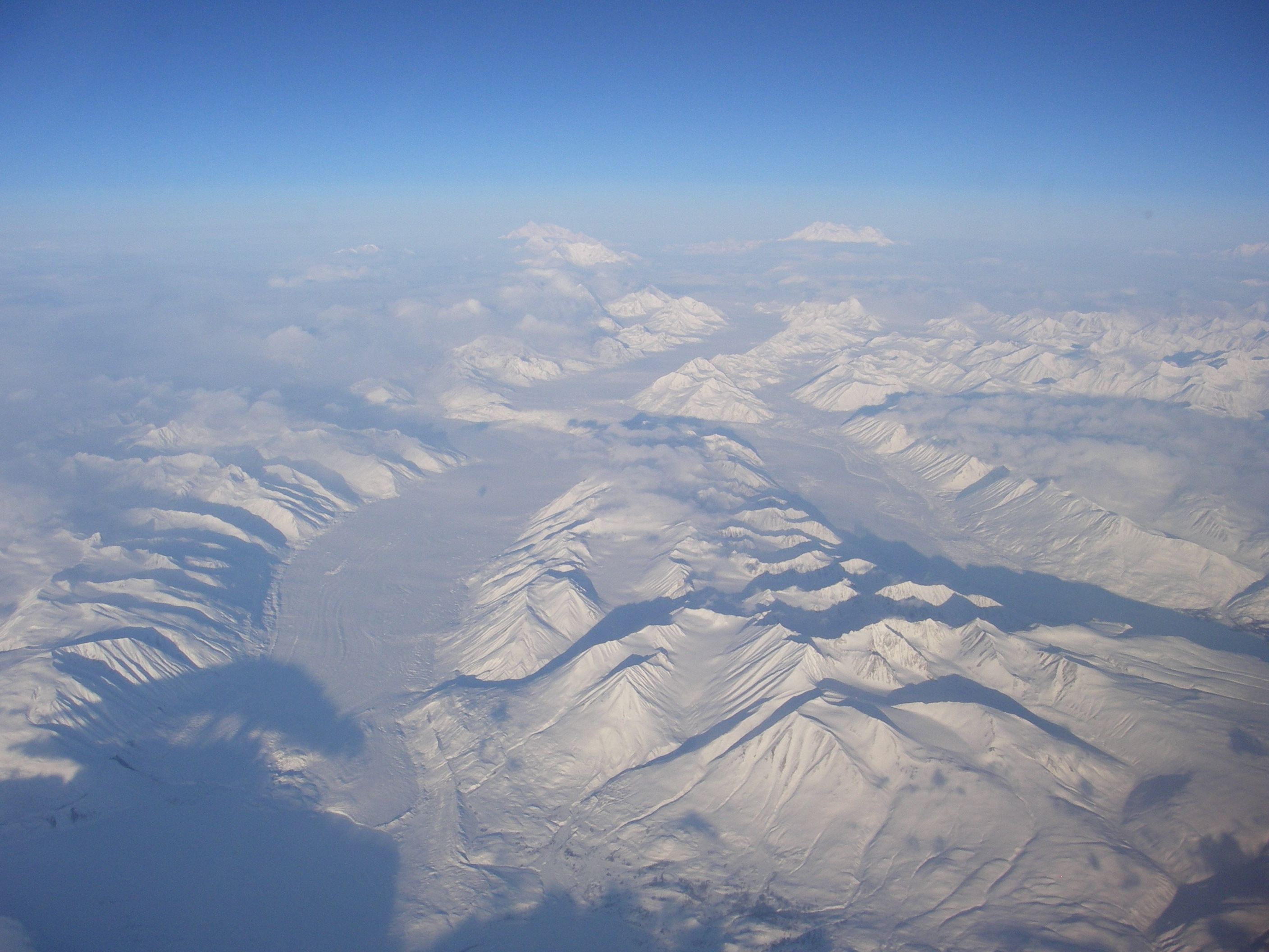 This photo shows two separate glaciers that come together at one point near the top of the picture. Taken on the flight from Fairbanks to Seattle.