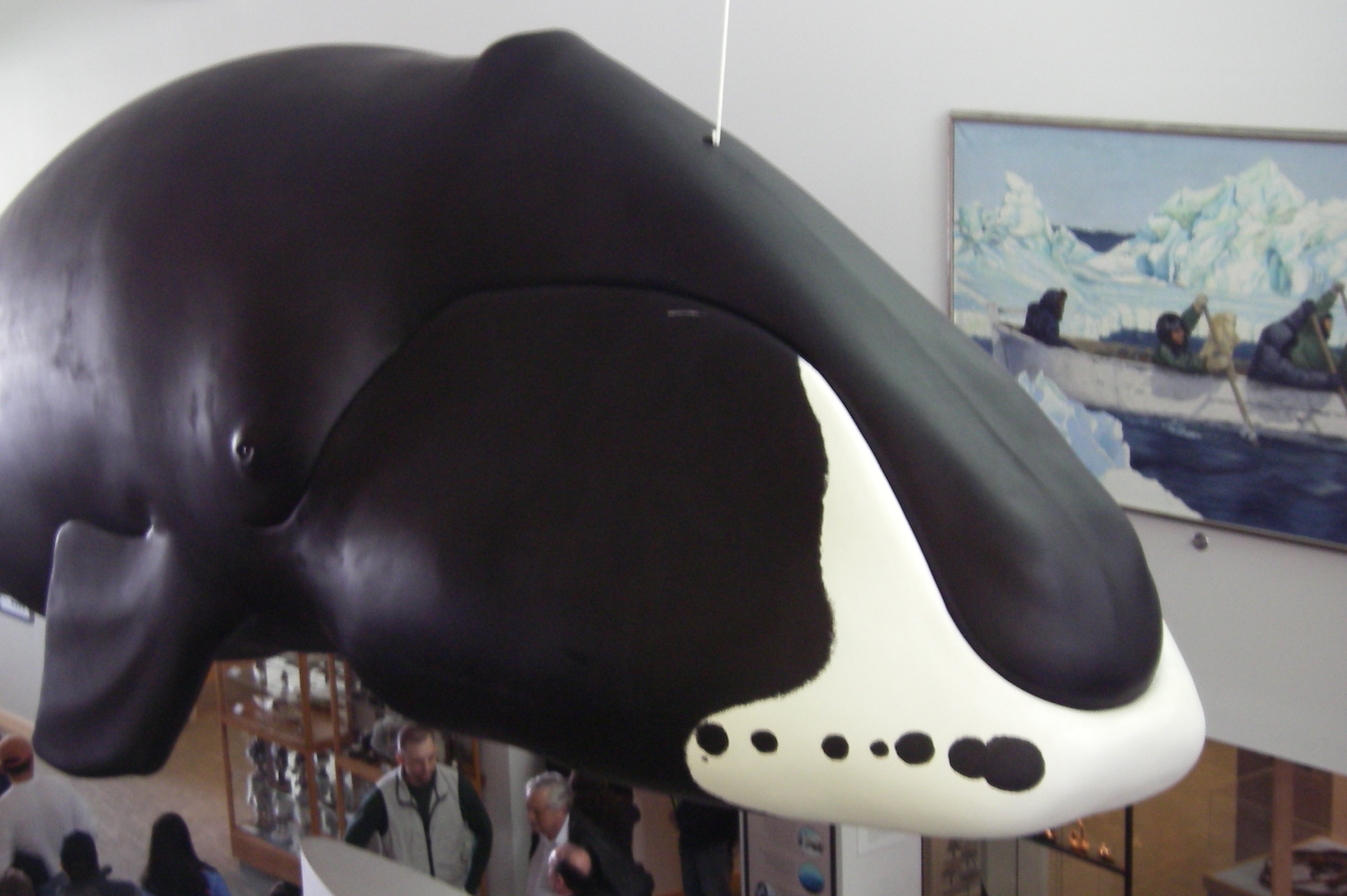 A model of a bowhead whale that hangs from the ceiling of the Inupiat Heritage Center in Barrow, Alaska.