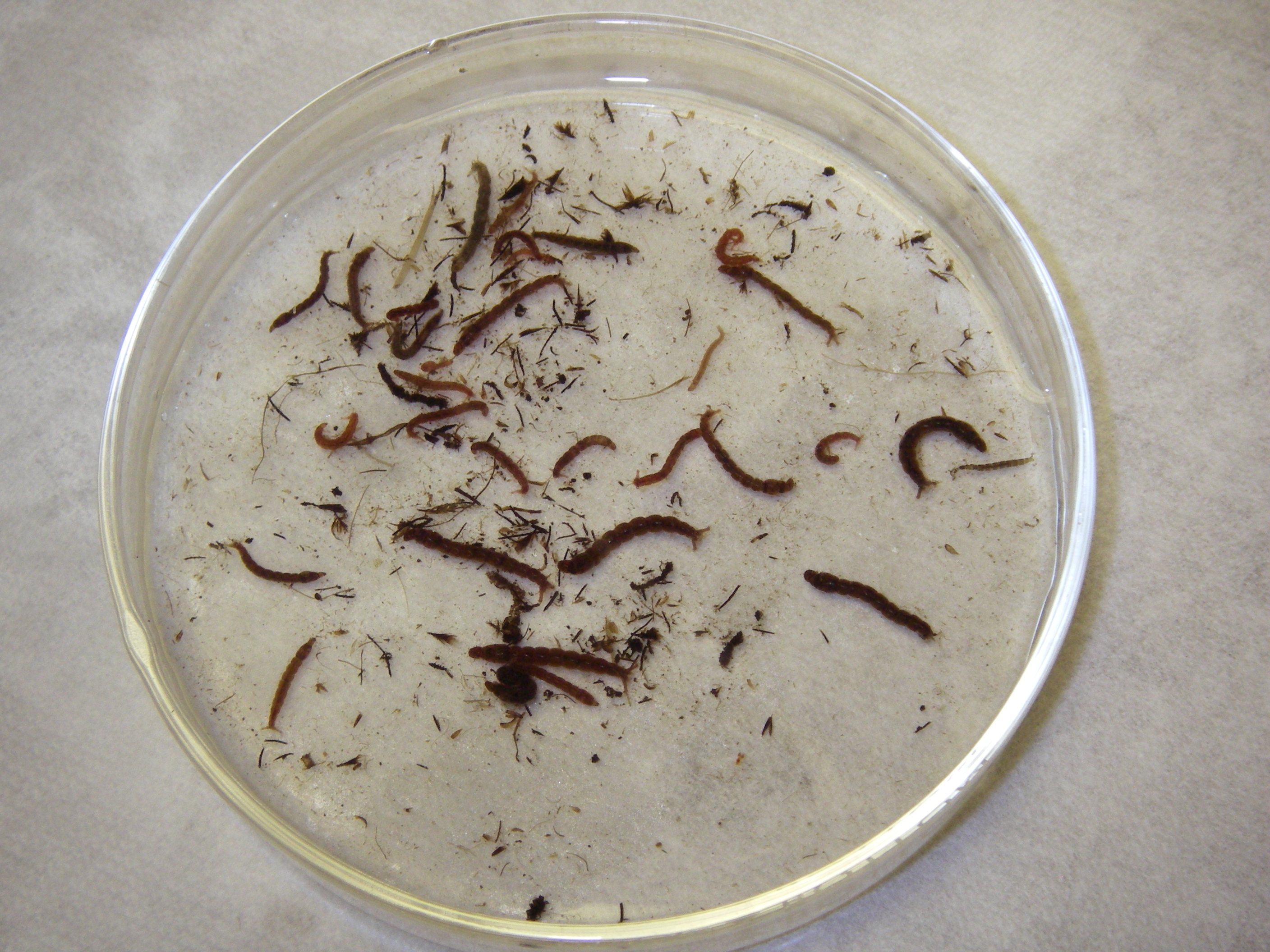 This photo shows a petri dish containing chronimids, which are aquatic macroinvertabrates found in the waters of the tundra. Photo taken in one of the labs at the BASC facility.
