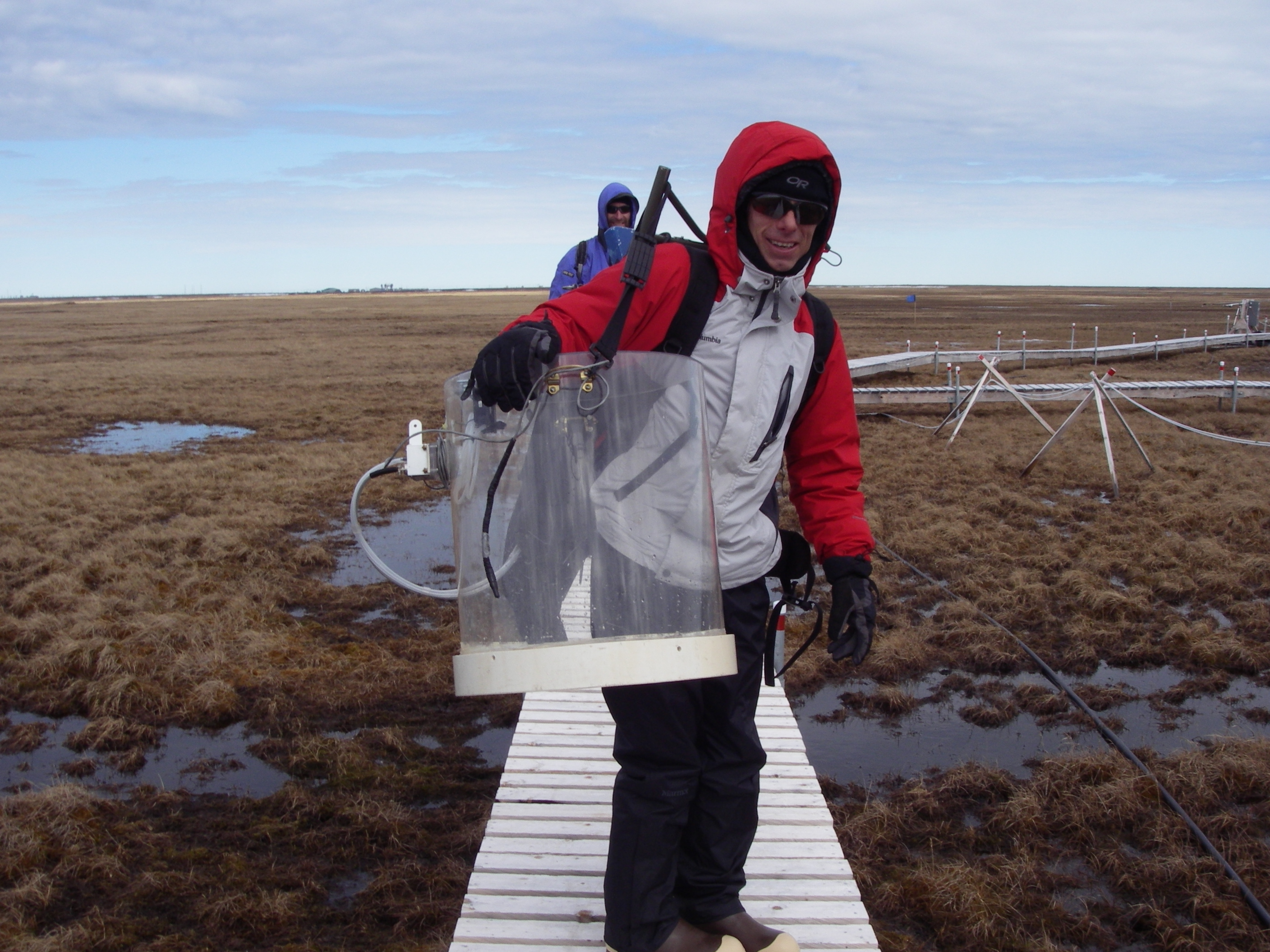 Rob Wilder is packing the chamber that was use to measure the carbon fluxes on the plots. The chamber, LI-COR 6200, and batteries all weigh in at about 50 pounds. At the biocomplexity site at the Barrow Environmental Observatory.